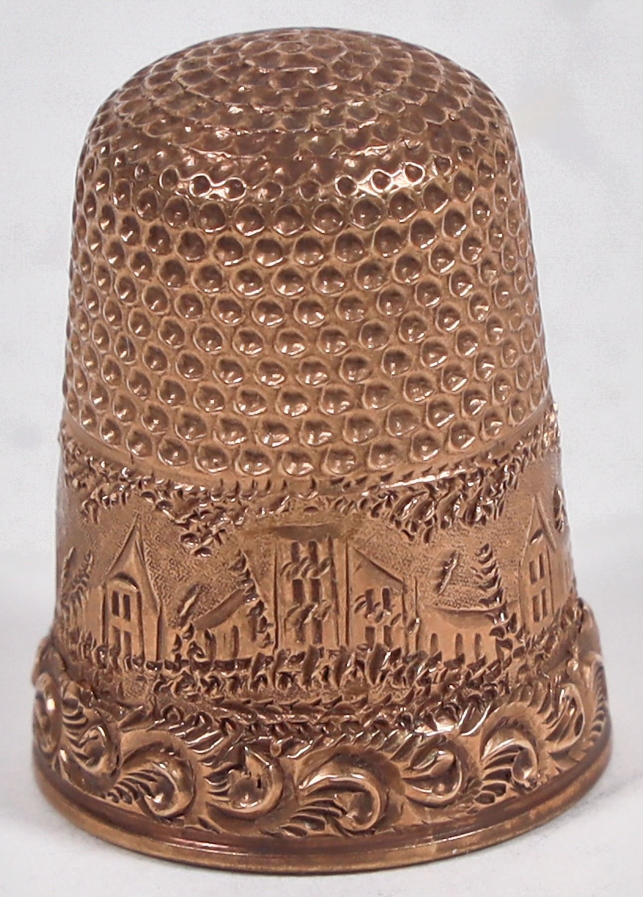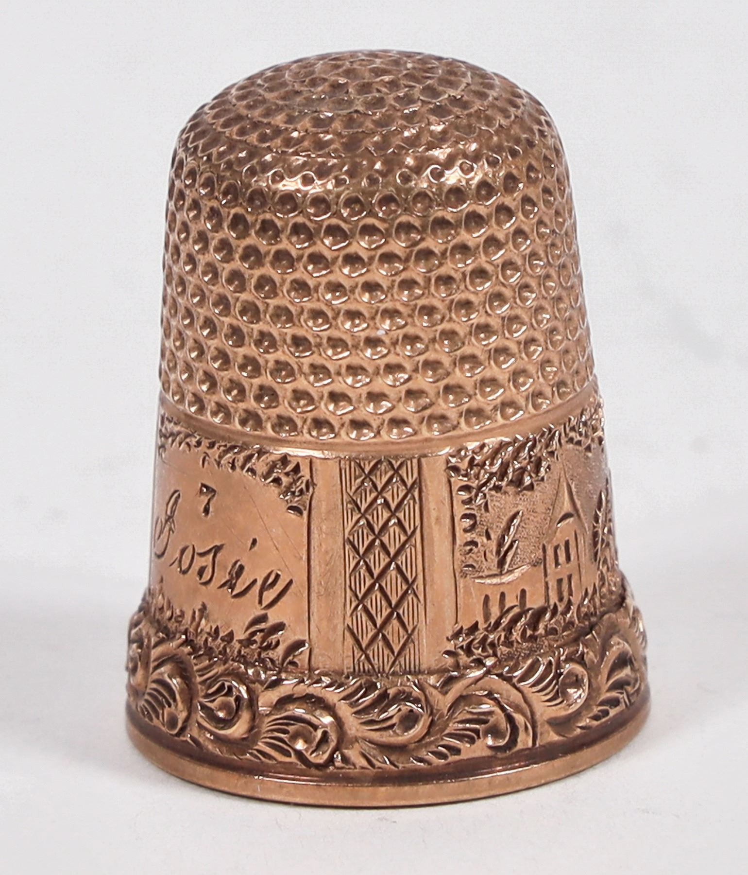 Sewing thimble, 15 mm wide and 20 mm tall engraved "Josie." Tests 14 carat gold; 4.6 grams.