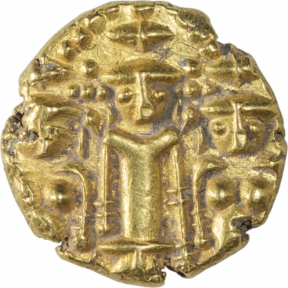 Madras Presidency, Fort S.t George Mint, Gold Pagoda (3 Swami Pagoda), Obv:full length figure of venkateswara standing facing, flanked by his two consorts, sridevi and bhudevi, Rev: granulated field, 3.41g,12.52mm, (KM # 289), choice extremely fine+, Rare.