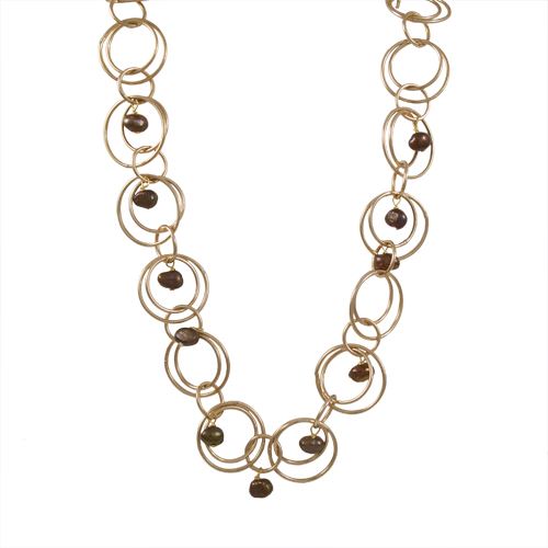 Gold Tone Brass Circle Necklace With Assorted Color Pearls Dangling