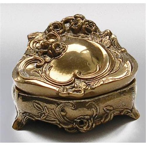 This Art Nouveau style heavy bright golden brass jewelry box is not marked so its age is not known. Likely produced during the 1950s. Featuring roses, buds, leaves and a swirled stem motif. Curved handle, hinged, ornately decorated and nicely lined in blue velvet with blue velvet on the bottom. Measuring about 5 inches long x 3 inches tall. With only light wear to the gold finish, due to age, otherwise this lovely jewelry box, including its lining, is in very good condition.
