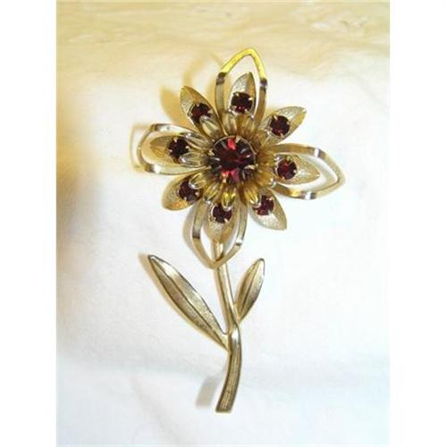 This flower pin is well made and very stylish. Nice gold-tone color with deep red glass stones. The stones are prong set and in good condition. No markings on the piece. It is from the estate of Miss Irene Breland who was a long time and greatly loved teacher in the Jackson, MS school system.