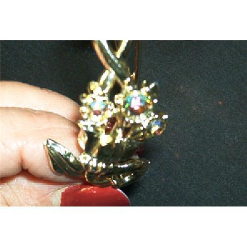 Featuring for auction today, is a beautiful gold toned bracelet with glass rhinestones. (Very Hard To Get Good Pictures). Open link bands, with the center featuring gold tone vines and gold tone tulip flowers with three dogtooth glass dentelles. Beautiful sparkles. Changes colors with movement. The dentelles measures: the largest measuring 3/4 inch in diameter with the two outer dentelles measuring 1/4 inch in diameter. The bracelet measures 7 inches. Width at widest area of the bracelet measues 1 inch; the thickness measures anywhere from 1/16 inch to 1/4 inch thick in different areas. A beautiful bracelet with glass rhinestones. Excellent Conditon.