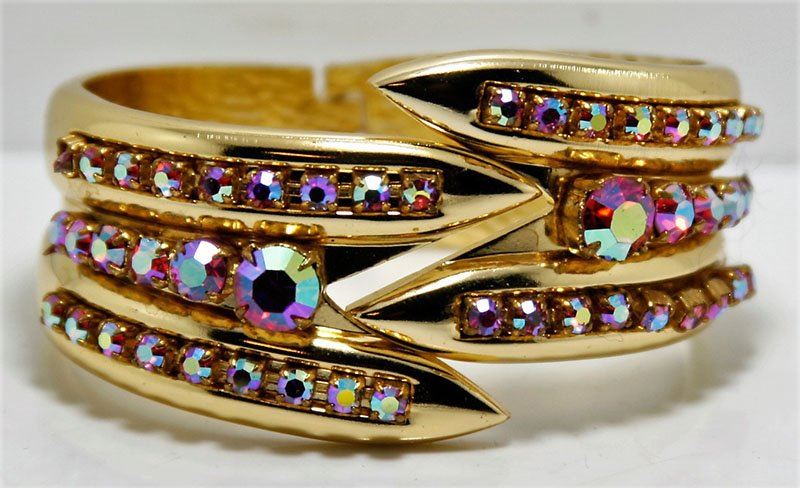 Gold Tone & Rainbow Rhinestone Hinged Cuff Bangle Bracelet