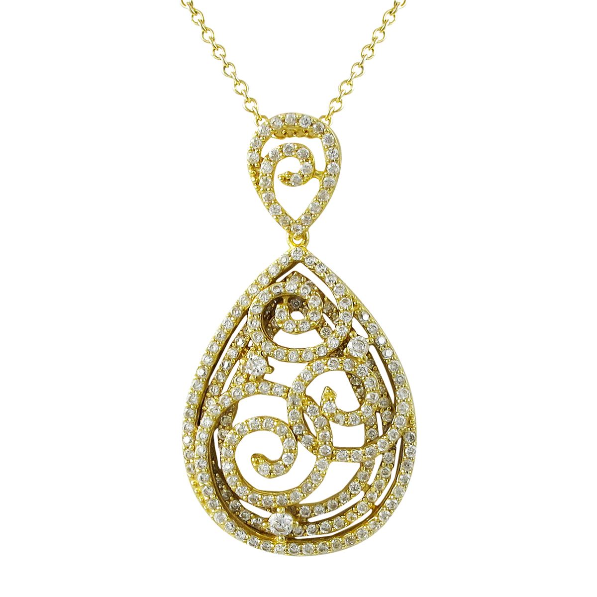 Gold Tone Sterling Silver CZ Filigree Teardrop Pendant- 2.08"
