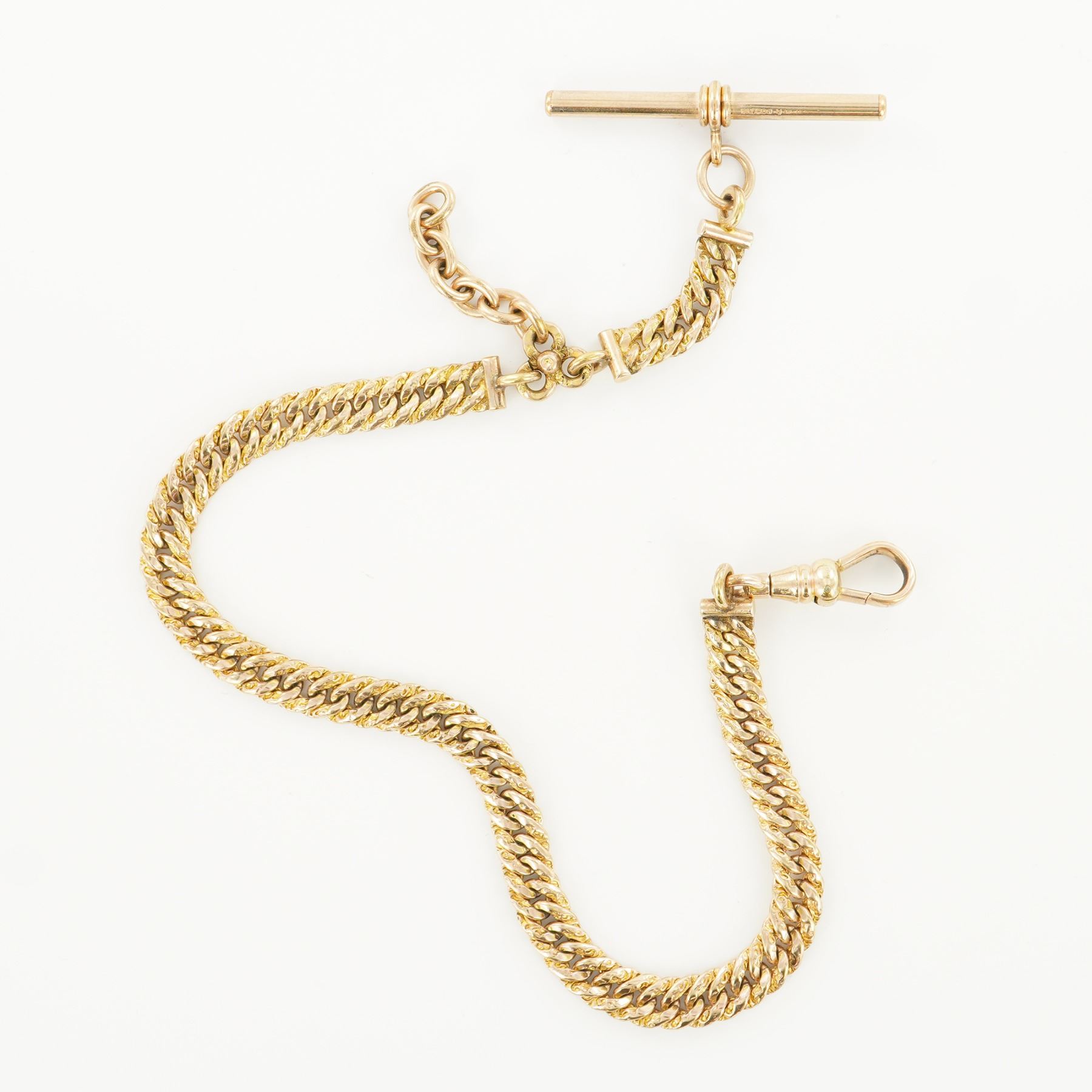 Gold-tone pocket watch chain featuring a double curb link design with a T-bar and swivel clasp ends. The T-bar is attached via a short looped chain, and the opposite end has a spring-loaded swivel clasp for secure attachment. The chain is constructed with interlocking twisted links, and the hardware components are consistent in finish. The overall design is functional for use with a pocket watch, allowing attachment to a waistcoat or belt loop. From clasp to the end of the T-bar fob measures: 11"L. Measurements are approximate and may vary slightly.