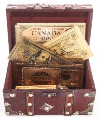 Treasure Chest of Gold Collectibles Unlock a trove of golden delights with this stunning Treasure Chest of Gold Collectibles! This unique set includes: ✨ 20 - Gold Banknotes – A dazzling collection of intricately designed banknotes plated in gold, adding a touch of opulence to any collector’s display. 🎴 Gold-Trimmed Playing Card Set – Elevate your game night with a deck of premium playing cards accented with shimmering gold detailing, perfect for card enthusiasts and collectors alike. 💰 Glass Assayer’s Jar of 23kt Gold Leaf Flakes – A mesmerizing vial of genuine 23kt gold leaf flakes, a striking conversation piece that captures the allure and value of this precious metal. Housed in a beautifully crafted treasure chest, this set embodies luxury, history, and the timeless appeal of gold. A must-have for collectors, history buffs, or anyone who appreciates the finer things in life!