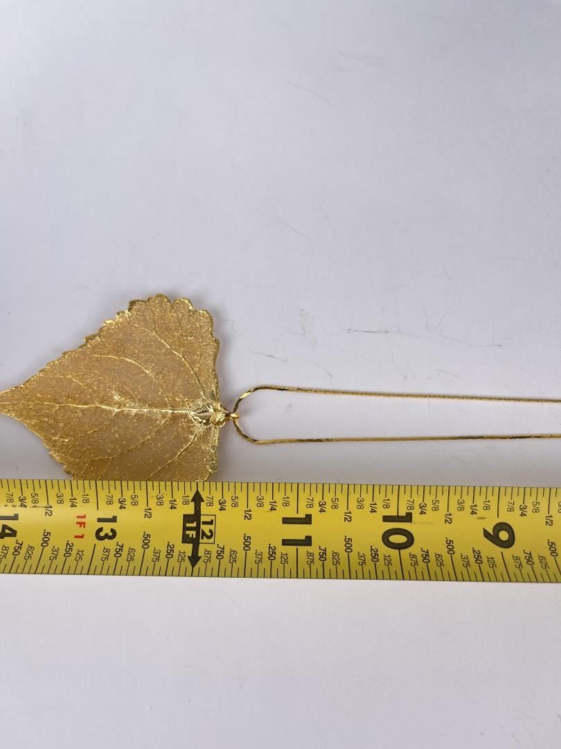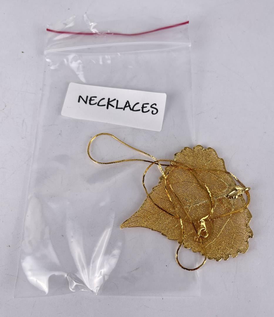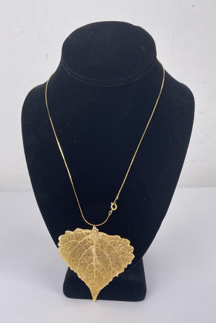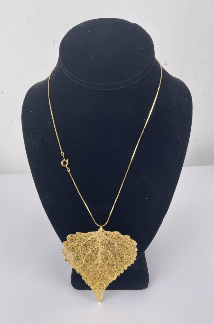 Nice necklace. Made by pouring gold plated material over a natural tree leaf.