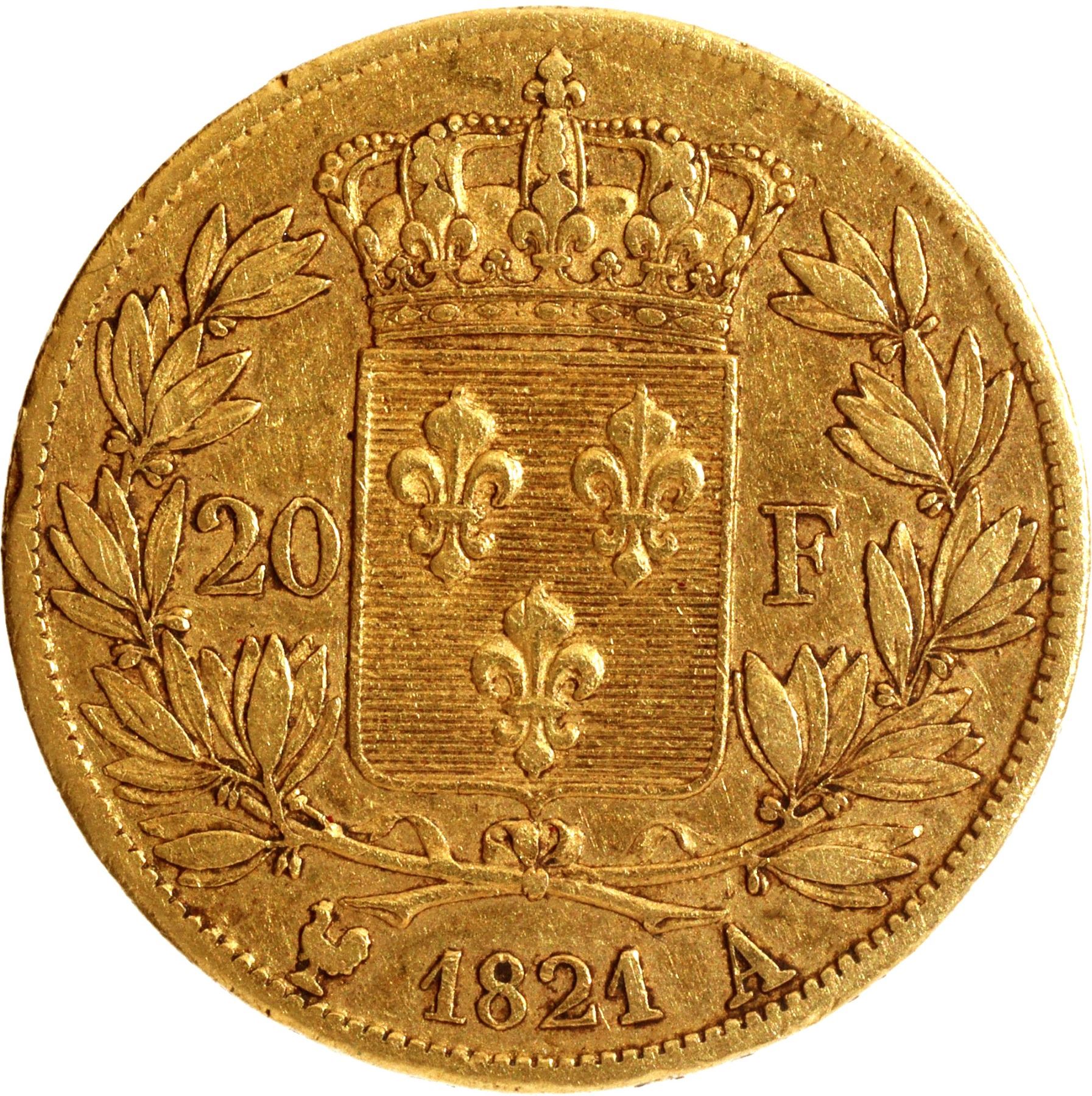 France, Louis XVIII, Gold 20 Francs, 1821 A, Paris Mint, Obv: portrait of the king facing right, lettering “LOUIS XVIII ROI DES FRANCE” around, Rev: a crowned shield with three fleur-des-lis in it, divided denomination by the sides, all within a laurel wreath, date, privy mark-cockrel and mint mark ‘A’ in the exergue, lettering on the edge, 6.42g, 21.10mm, (KM # 712), about very fine, Rare.
