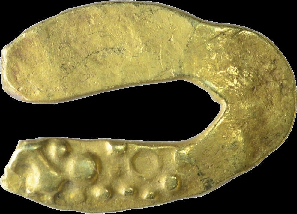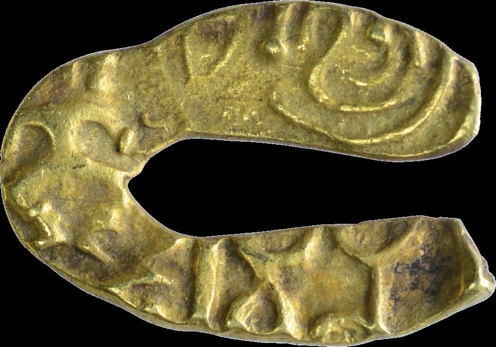 Shilaharas of Karahad (Feudatories ofChalukyas of Kalyana), Wai-Karhad Region, Gold Fanam (U Shaped), Obv: three punches, cross-legged human figure on the apex, dagger and kannada legend Shrion the left arm, kannada legend Wara(sa?)on the right arm,Rev: on the right arm also bears a tiny impression of a lotus-like mark accompanied by an unidentified motif, 0.48g, 11.15mm,about extremely fine, Rare.
