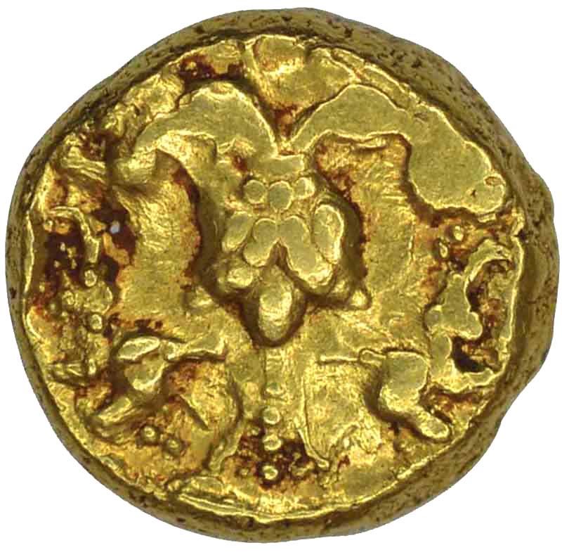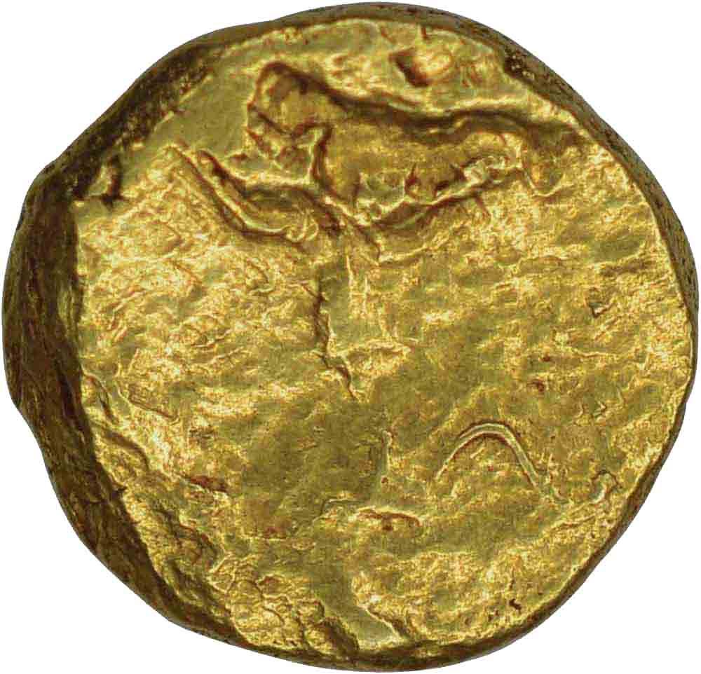 Vijayanagar Empire, Achyutaraya,(1529-1942 AD),Gold Varaha, Obv:back view of gandaberunda (twin headed eagle) flying upwards, wings and feathers are ornamented and crest head, bird is flying upwards carrying in each of its two beaks two claws a fully grown tusker elephant,Rev:uniface,3.45g, 11.24mm,about very fine,Rare.