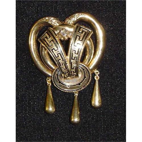 Circa. 1860 14K gold tested with 14K acid. Diamond tested with a diamond tester. Single diamond with weight of approx. .15 carats. hand-chased with black enamel. Also, 3 tear-drop dangles. Excellent condition.
