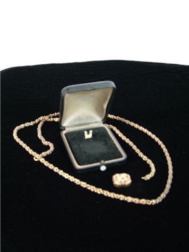 Baileys gold watch chain with slide, long and doubled band, 19 1/2"; slide has as flower in center with a pearl, 3/4" by 3/4"
