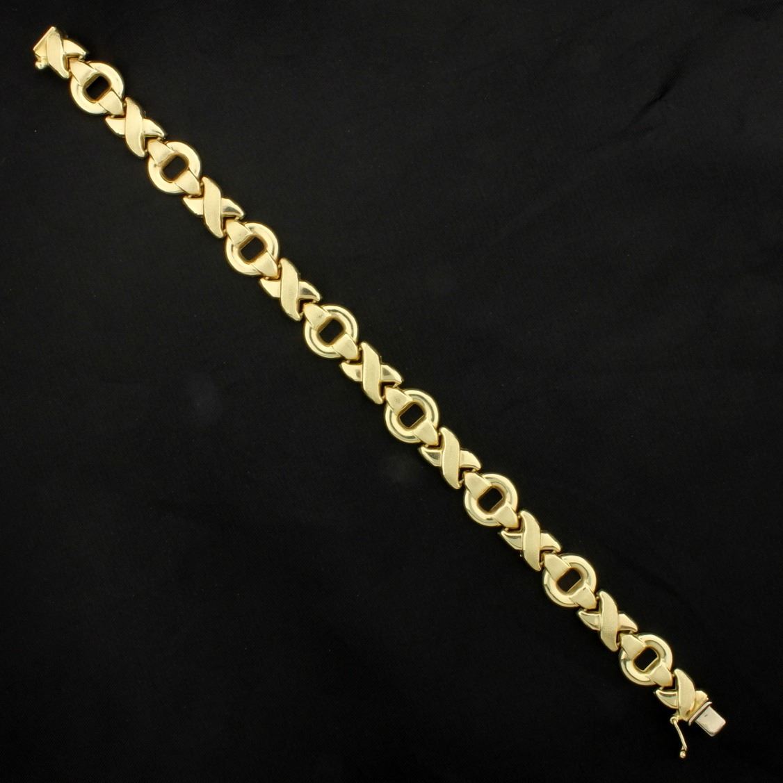 14K yellow gold, it is 8 inches long and 11.8mm wide, with a safety clasp. 12.3g
