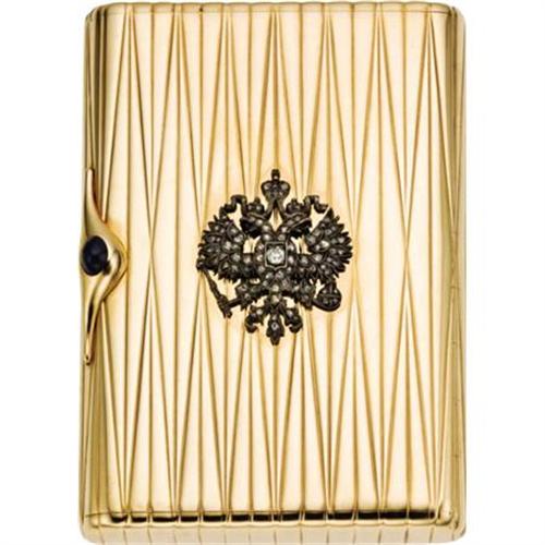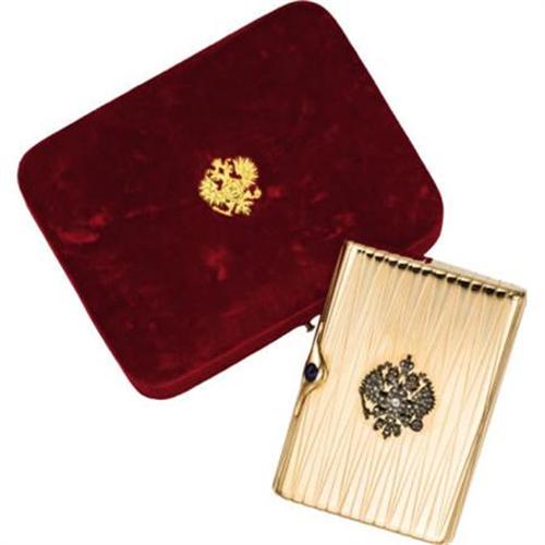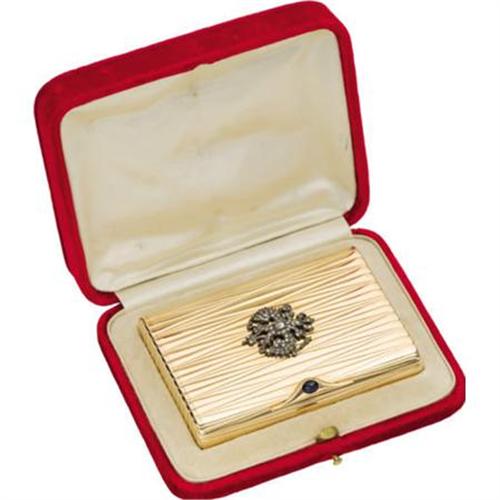 <B>Russian Gold and Diamond Imperial Presentation Cigarette Case</B></I><BR><I>Marked Carl Blank, St. Petersburg, 1908-17</B></I><BR><BR>Overall decorated with a tapering reeded pattern, the hinged cover applied in the center with a Russian double-headed eagle set with rose and antique-cut diamonds, with cabochon sapphire pushpiece-3 5/8 x 2 3/8 in. <BR>In original red velvet fitted case stamped with a gold Imperial Russian double-headed eagle<BR><BR>Like many of Russia's finest jewelers, Carl Carlovich Blank was born in Finland and moved to St. Petersburg to learn his trade. He registered in the capital as a gold and silversmith and joined the renowned firm of Karl Hahn at 26 Nevskii Prospect, being made partner in 1911. Awarded the Imperial warrant at the end of the 19th century, the firm competed with Fabergé for Imperial commissions. Carl Blank won prizes for excellence at an exhibition in 1896 and won favor with the Imperial family by specializing in the diamond presentation gifts for the Russian Court. <BR><BR>Provenance:<BR>Christie's, New York<BR><BR><BR><BR><b>Shipping:</b> Requires 3rd Party Shipping (<a target="_blank" href="http://www.heritageauctions.com/common/shipping.php">view shipping information</a>)