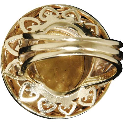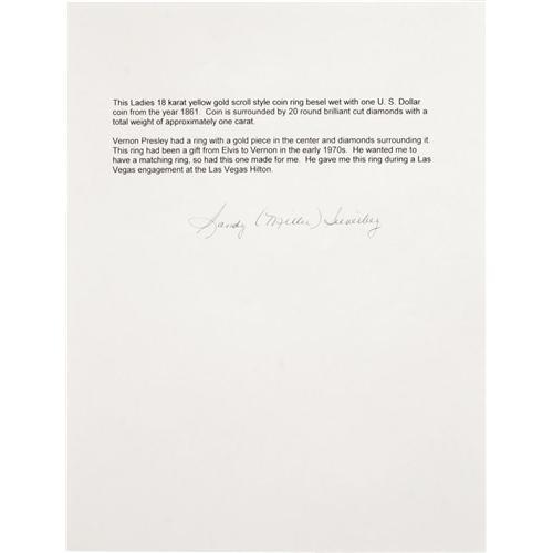 <B>Gold and Diamond Ring From Elvis.</B></I> An attractive 18-karat gold ring featuring an 1851 U.S. dollar coin surrounded by 20 brilliant cut diamonds with a total weight of approximately one karat. Elvis had given a similar ring to Vernon Presley in the early '70s, and had this duplicate made as a gift to Sandy Miller during an engagement at the Las Vegas Hilton. A beautiful piece. <I>From the Sandy Miller Collection</B></I>.<BR><BR><b>Shipping:</b> Clothing, Costumes & Jerseys (<a target="_blank" href="http://www.heritageauctions.com/common/shipping.php">view shipping information</a>)