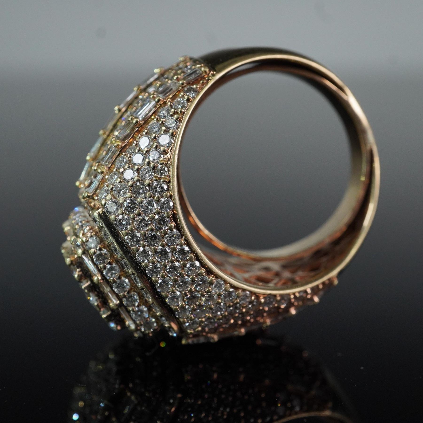 This substantial gold ring is pave-set with 210 round brilliant-cut diamonds, totaling approximately 4.25 carats in combined weight. The densely set diamonds create a continuous surface of shimmer across the domed form of the ring, delivering bold brilliance. Crafted in approximately 15.89 grams of gold, this piece offers both impressive presence and refined sparkle. A striking addition to any fine jewelry collection.