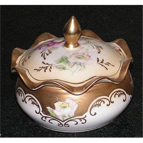 Produced by Royal Crown Porcelain this hand painted powder jar is decorated copiously with gold paint and various flowers and other flora. The rim of the lid is wavy with a gold pointed finial. Marked on the bottom with a Crown and written in gold - Royal Crown - Hand Painted - 819. Measures about 5 inches in diameter x 4 inches tall with both jar and lid in excellent condition