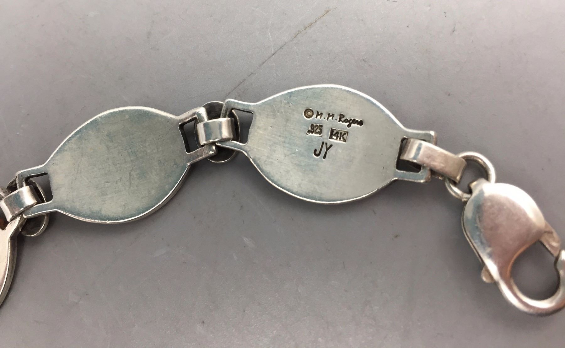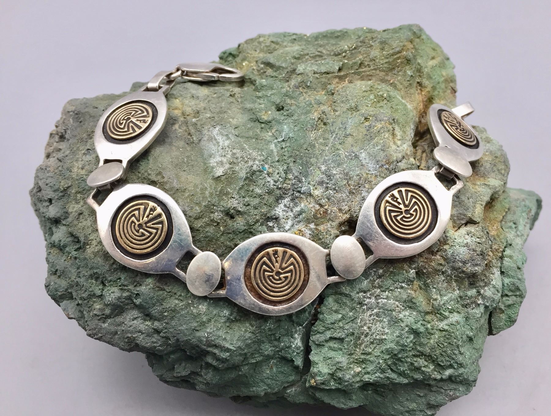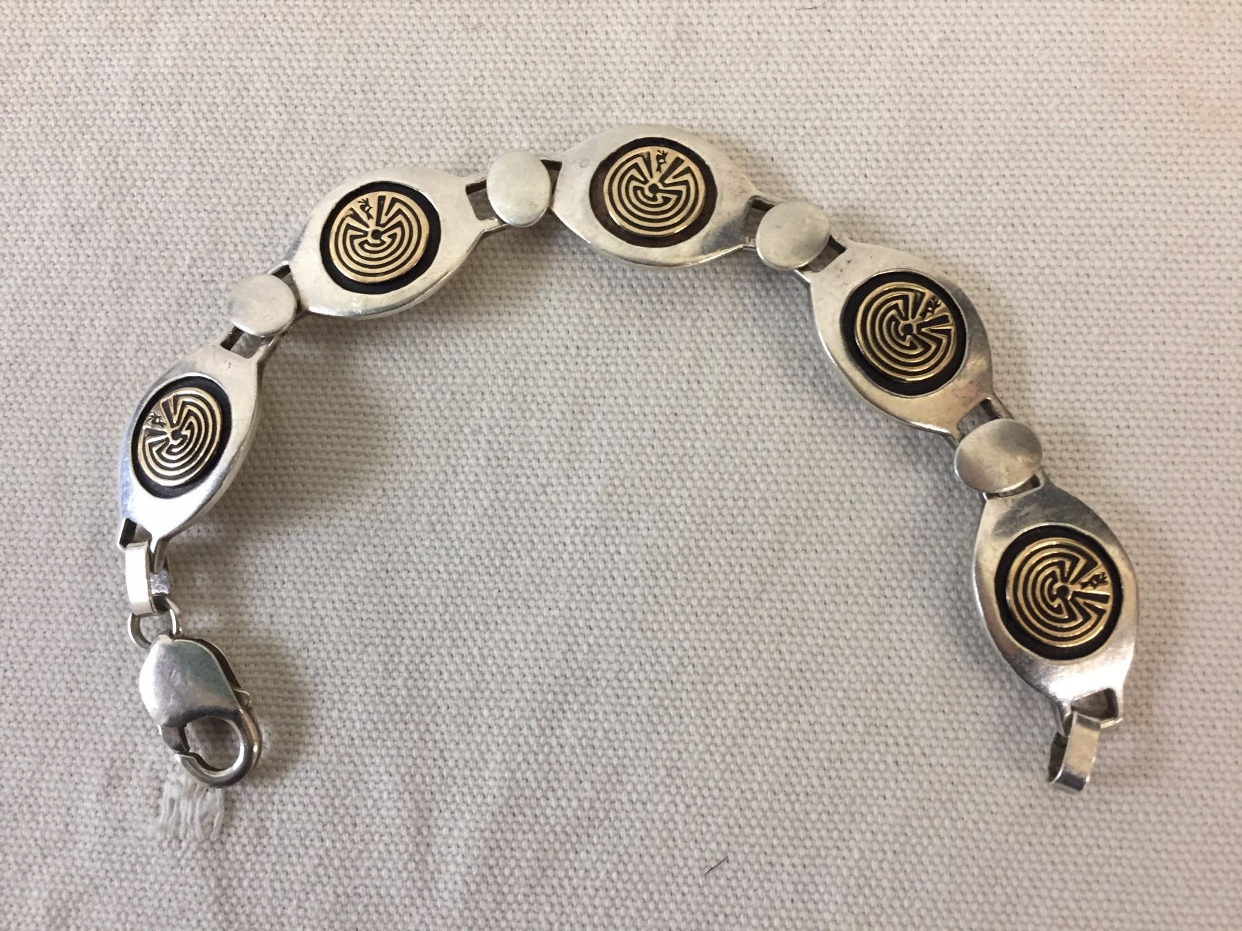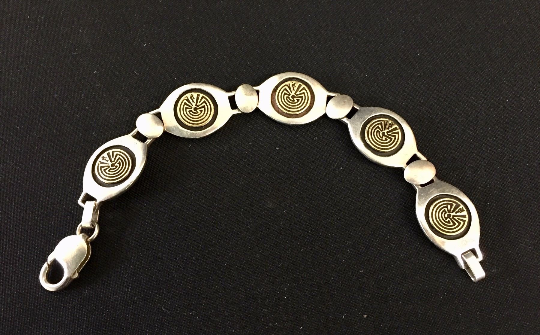 Description: Sterling silver bracelet with 14k gold accents. Has the Man-in-the-Maze designs. Maker: Hallmarked, JY and MM Rogers. .925 (sterling) and 14K. Approx. Age: Fairly contemporary. Size: Measures 7 1/4” l x 5/8” w. Weighs 32.9 g. Condition: Good for its age, normal wear expected. Please look closely at the pictures - they are an important part of our description. Shipping: There will be a $5 handling / packaging fee for shipping this lot. The actual cost of postage will be added on top of that.