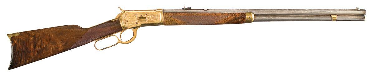 Made in 1895. Blade and semi-buckhorn sights, scroll engraved barrel and frame with deer scenes on the frame and checkered fancy high grade walnut stock. Silver (tarnished) barrel and magazine (including sights) and gold remaining parts.