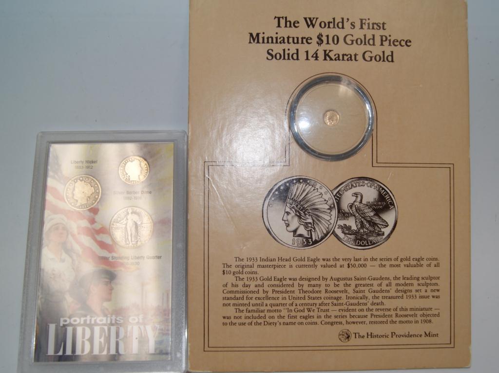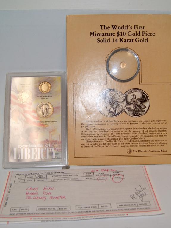 Sold Times the Money This includes the following: 1)Real 14KT Miniature Gold Coin of a 1933 Ten Dollar Gold Piece 2)Portraits of Liberty Coin Set with OriginalPrice of $23.95 in 2001