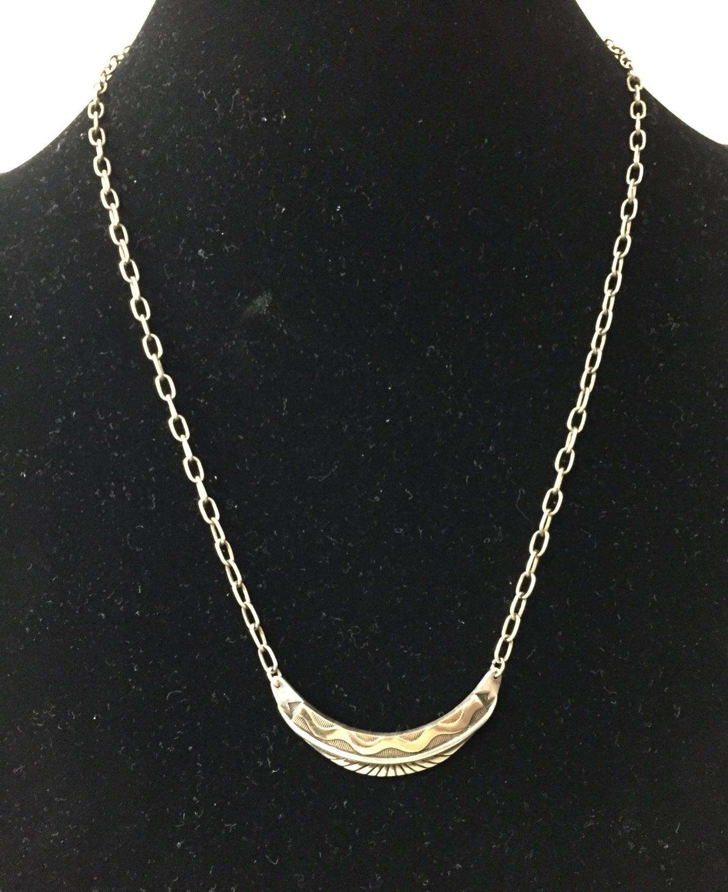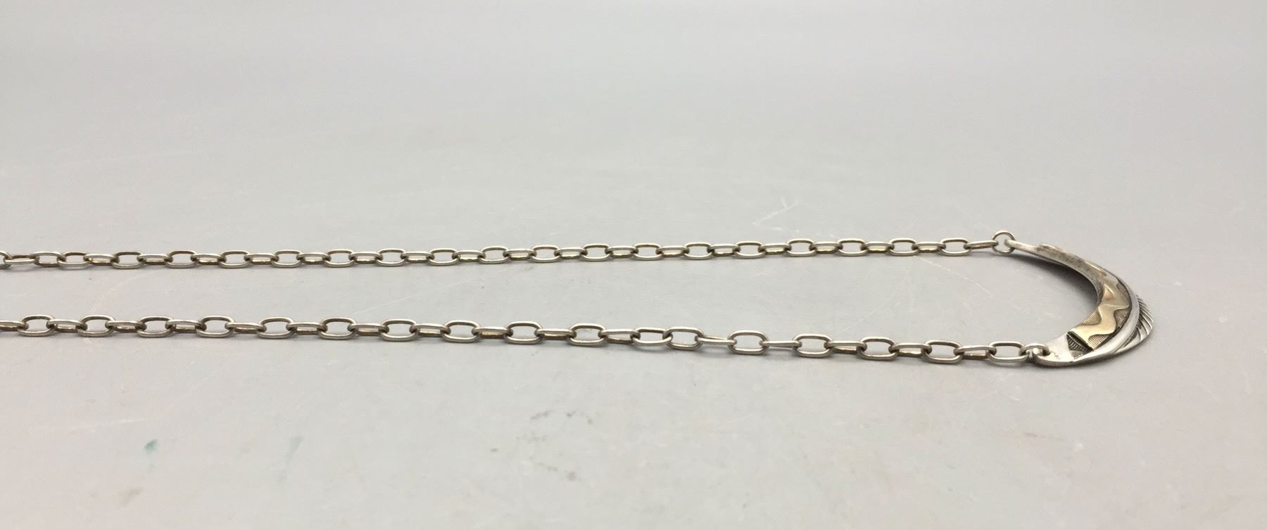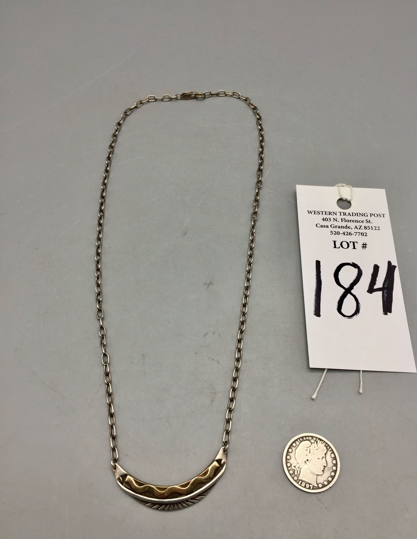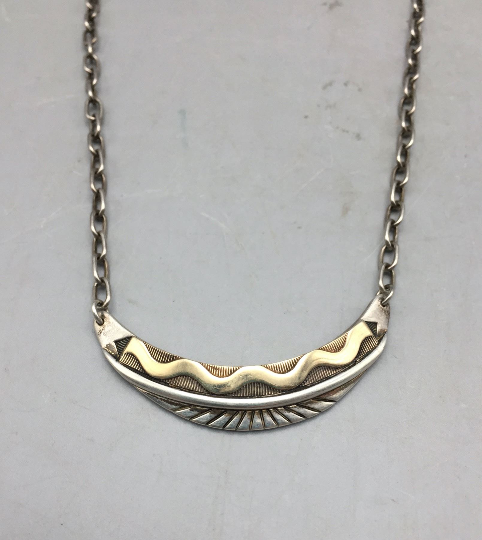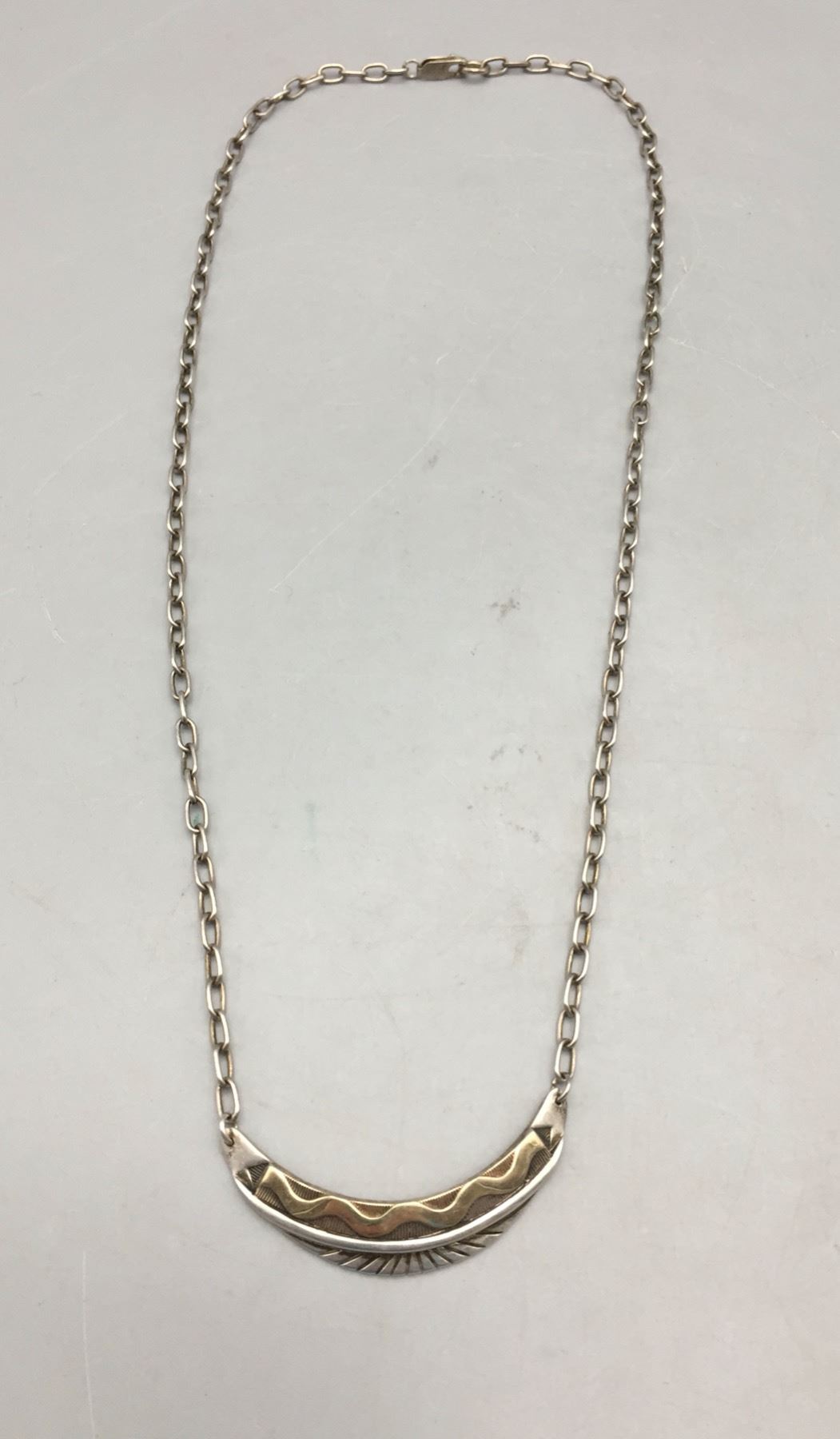 Description: Offered in this lot is a lovely gold and sterling silver necklace that has a beautiful overlay design. Stamped as sterling silver and 14k gold. Maker: Stamped, M.M. Rogers. Approx. Age: Vintage to modern. Size: Fits a 21†neck. Weighs 17.9 grams. Condition: Good for its age, normal wear expected. Please look closely at the pictures - they are an important part of our description. Shipping: There will be a $5 handling / packaging fee for shipping this lot. The actual cost of postage will be added on top of that.
