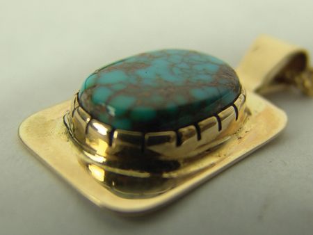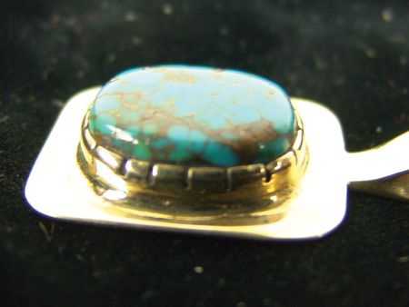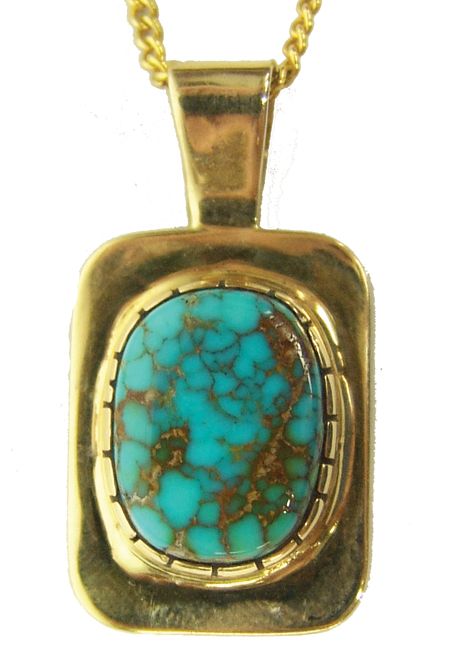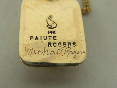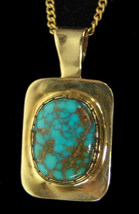 Late 1900s, Fine Navajo-style 14kt gold pendant with an exquisite gold matrix Godber turquoise stone. Very good condition, signed "Paiute-Rogers 14kt" and with his rabbit hallmark. From the Herb and Peggy Puffer collection, Folsom, California. 26-1/2" long, pendant 1-4/8" x 3/4"