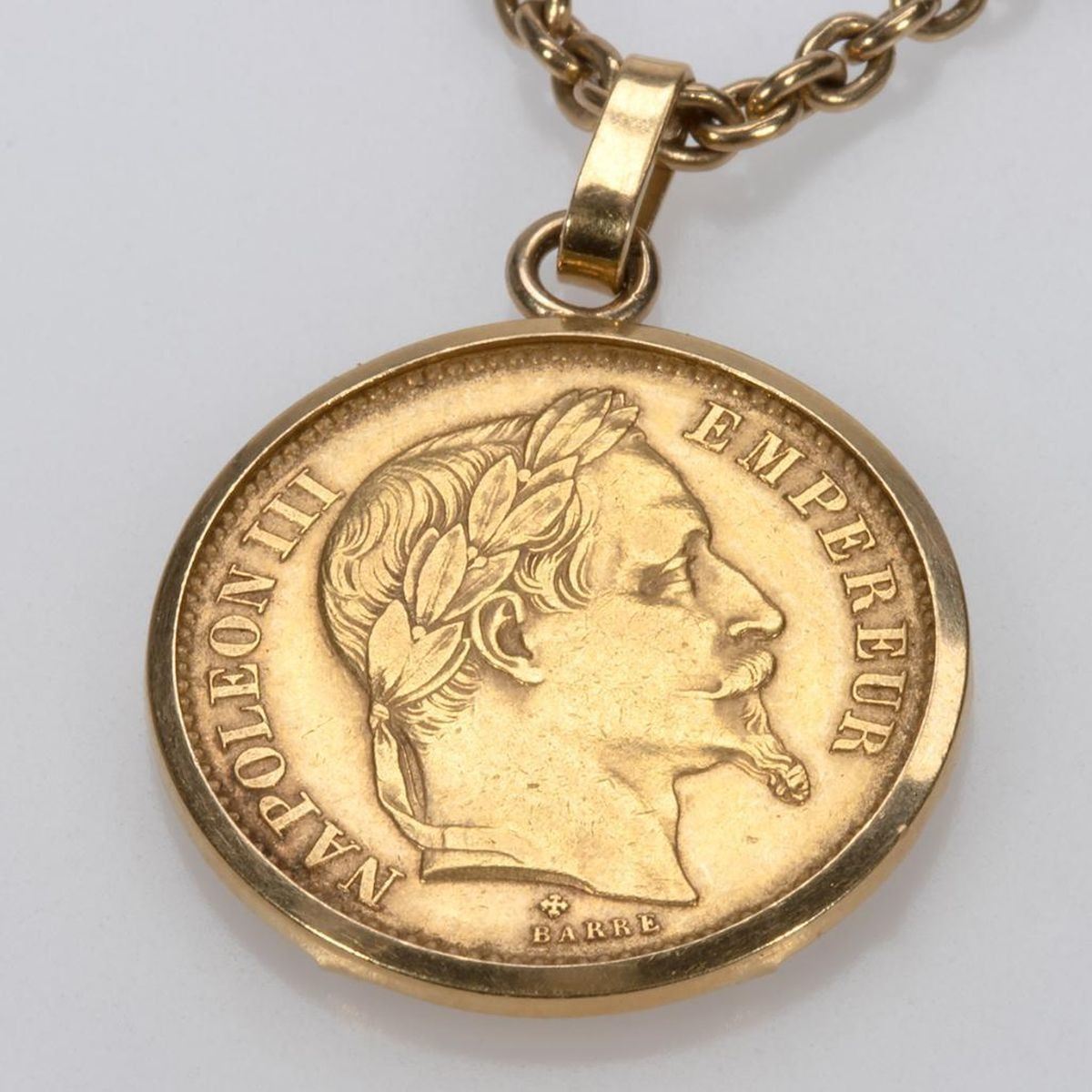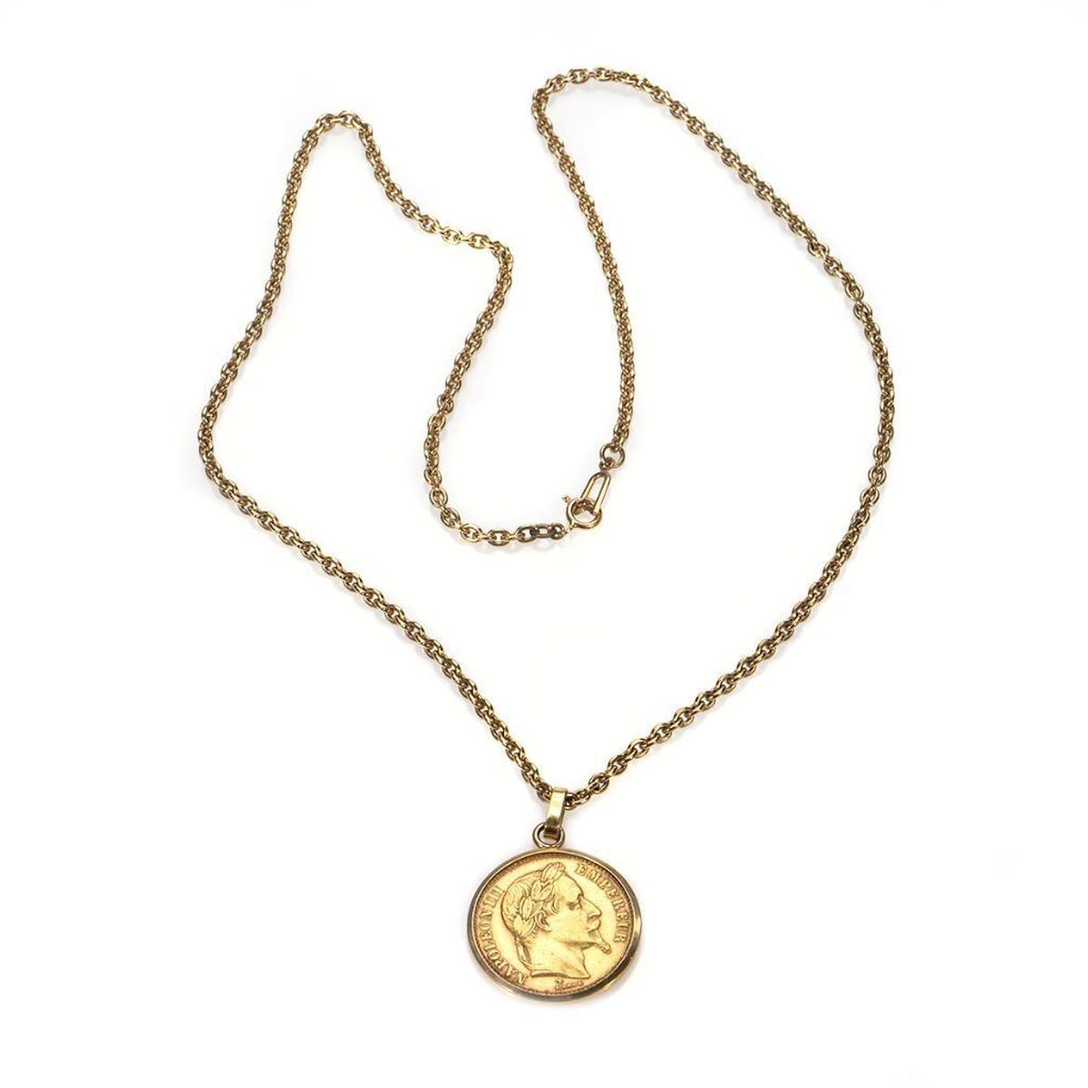 featuring an 1866 Napoleon III Empereur 20F gold coin, set in an 18k gold frame, suspended from a 14k gold cable link chain; gross weight approximately 16.8 grams; length: 18in.