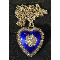 Gold diamond set and blue enamel heart shaped pendant locket on chain