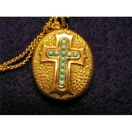 <tr><td>Title:Gold-filled Locket with Turquoise Cross</td></tr>