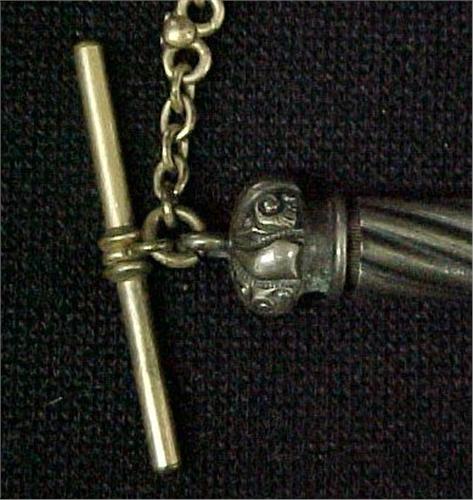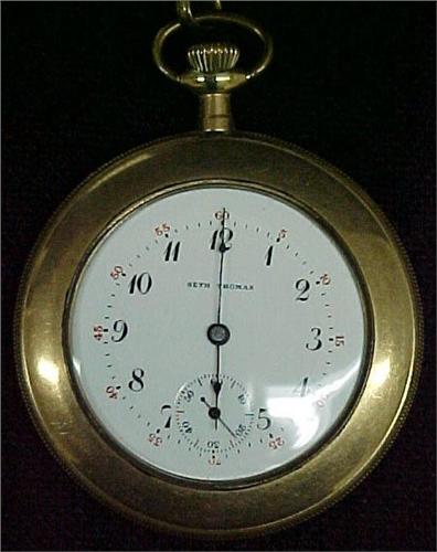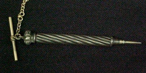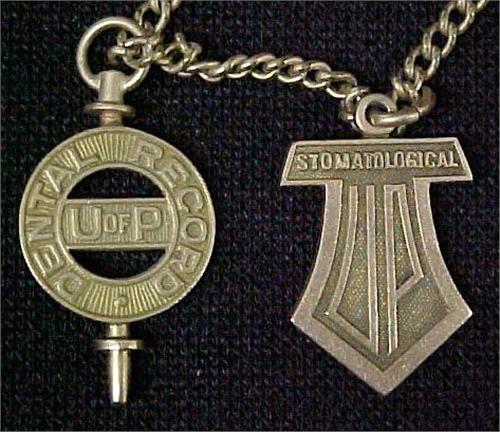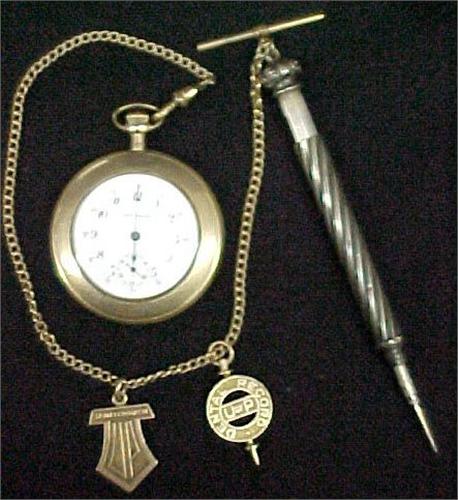 Gold filled Seth Thomas pocketwatch with chain; fobs and sterling pencil; watch has 15 jewel movement and measures 1 3/4" in diameter; 12" gold filled chain is marked Bigney and hold two 10k gold fobs from the University of Pennsylvania; retractable penci