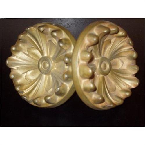Extremely rare English gold gilt bronze Georgian Regency Drapery tie backs. They date from 1820. The gold gilt has some wear and one tie back has three holes because of old age. The fronts are 4" 1/2 by 4"