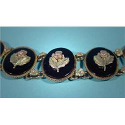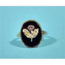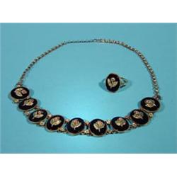 Gold link chain, black onyx and yellow and red gold roses, with matching ring, 14 Kt, l. 38 cm., …