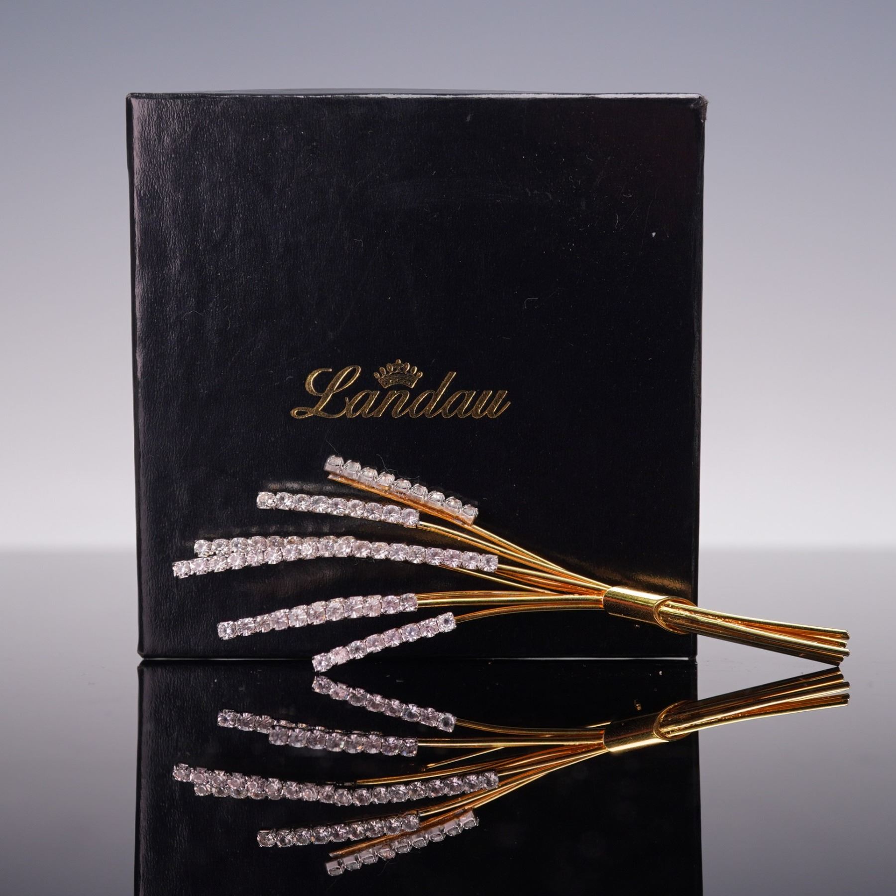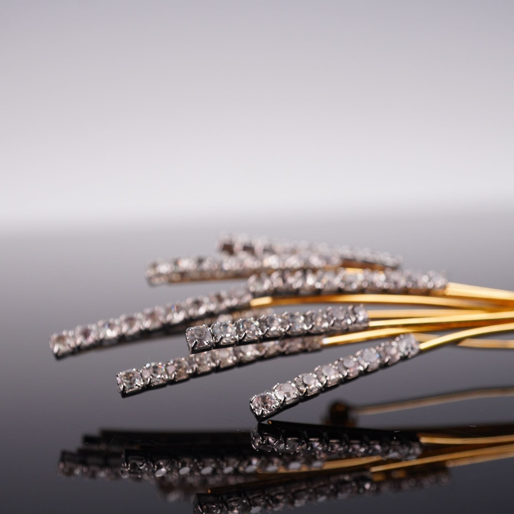 Vintage gold-tone brooch designed in the form of a stylized wheat bouquet or cattail cluster, accented with clear rhinestones. The brooch features a sweeping, organic arrangement of slender stems and tapered heads, evoking naturalistic charm. Measures approximately 4 inches long.