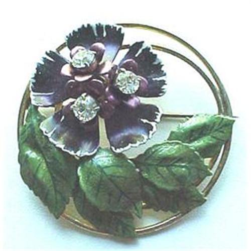 Goldwashed sterling circular pin with green leaves & purple violets.