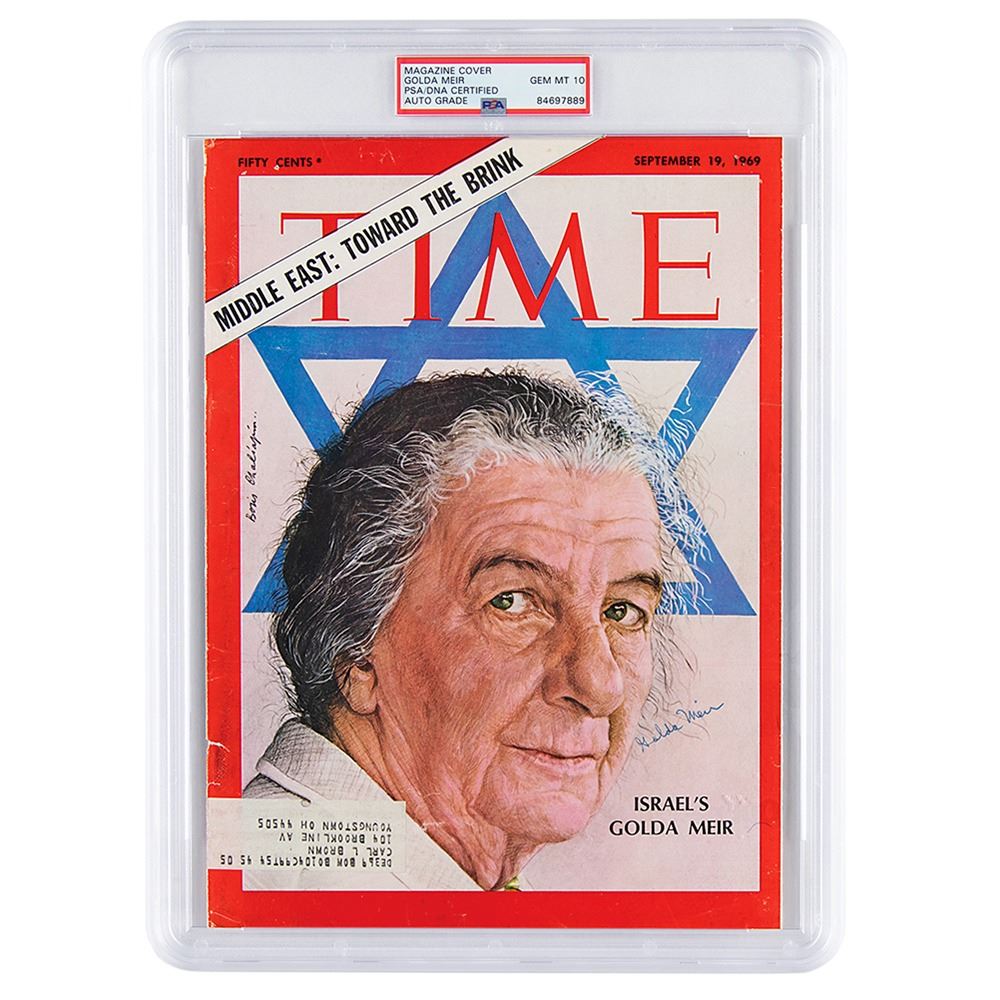 Cover from the Time Magazine of September 19, 1969, featuring a story on & #39;Israel& #39;s Golda Meir,& #39; 8 x 11, signed in blue ballpoint, "Golda Meir." In fine condition, with light creasing. Encapsulated and graded by PSA/DNA as "GEM MT 10."