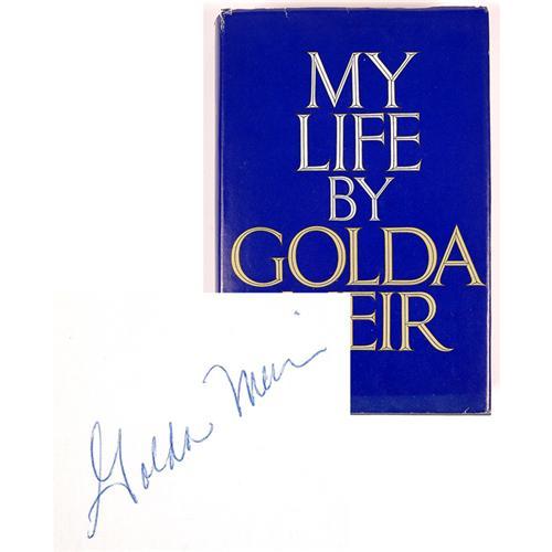 <Our item number 140798><B>Meir, Golda.</B> Book signed in blue ink on the first end paper, being the first American edition of her autobiography, <I>My Life</I> (New York: G.P. Putnam's Sons, 1975), 480pp., 9¼ x 6¼ in. Blue cloth covers with gilt lettering on spine. Interior is tight and clean. Dust jacket is toned with several small edge splits. The woman who became prime minister of Israel describes her personal and political journey. <BR>Estimated Value $600 - 800. <BR><BR>Our item number 140798<BR><IMAGES><P ALIGN="CENTER"><IMG SRC="http://www.goldbergcoins.net/liveauction/49jpegs/140798.jpg"> <BR><IMG SRC="http://www.goldbergcoins.net/liveauction/49jpegs/140798N2.jpg"> </P></IMAGES>