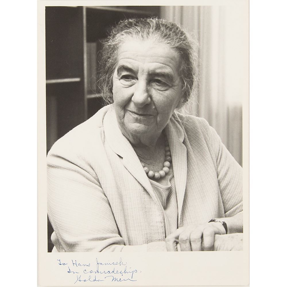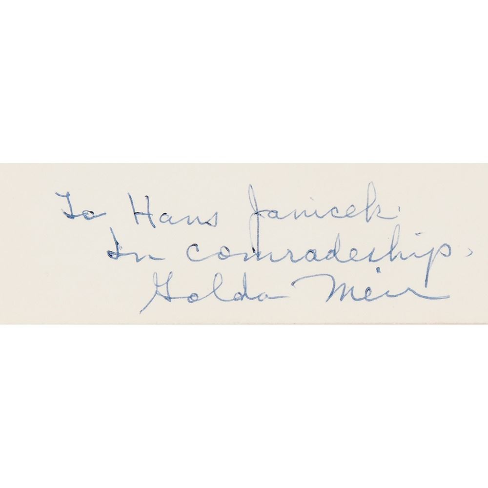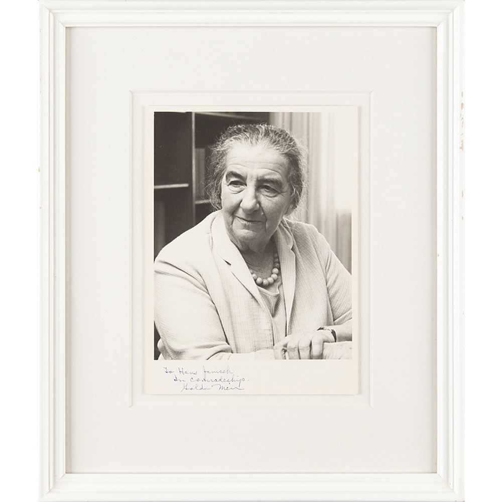 Glossy 5 x 7 photo of Meir in a pleasant head-and-shoulders pose, signed and inscribed neatly in the lower border in black ballpoint, "To Hans Janicek, In comradeship, Golda Meir.” Mounted and framed to an overall size of 10.25 x 12.25. In fine condition.
