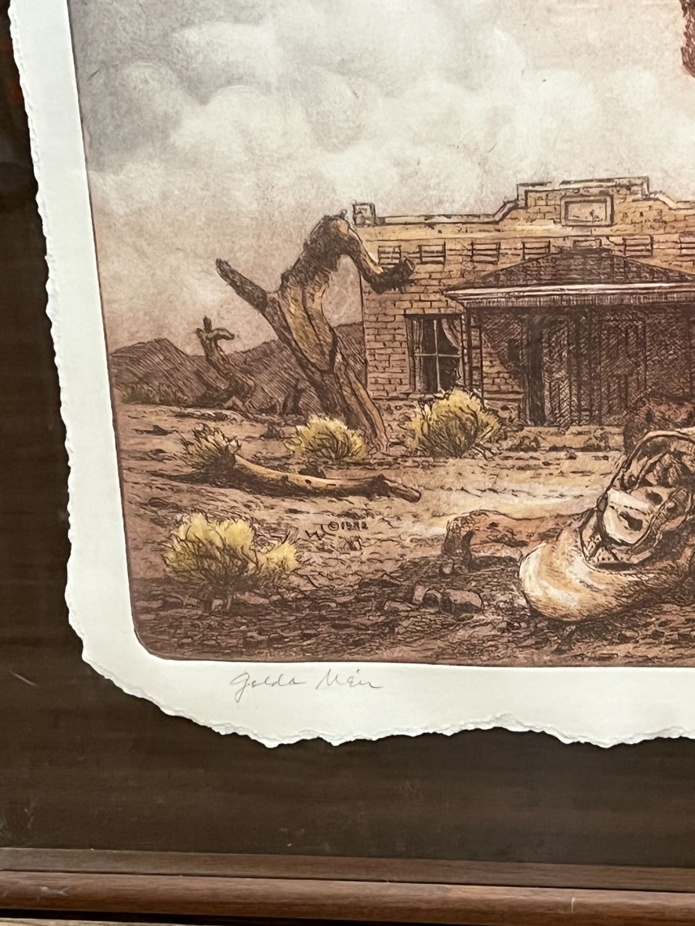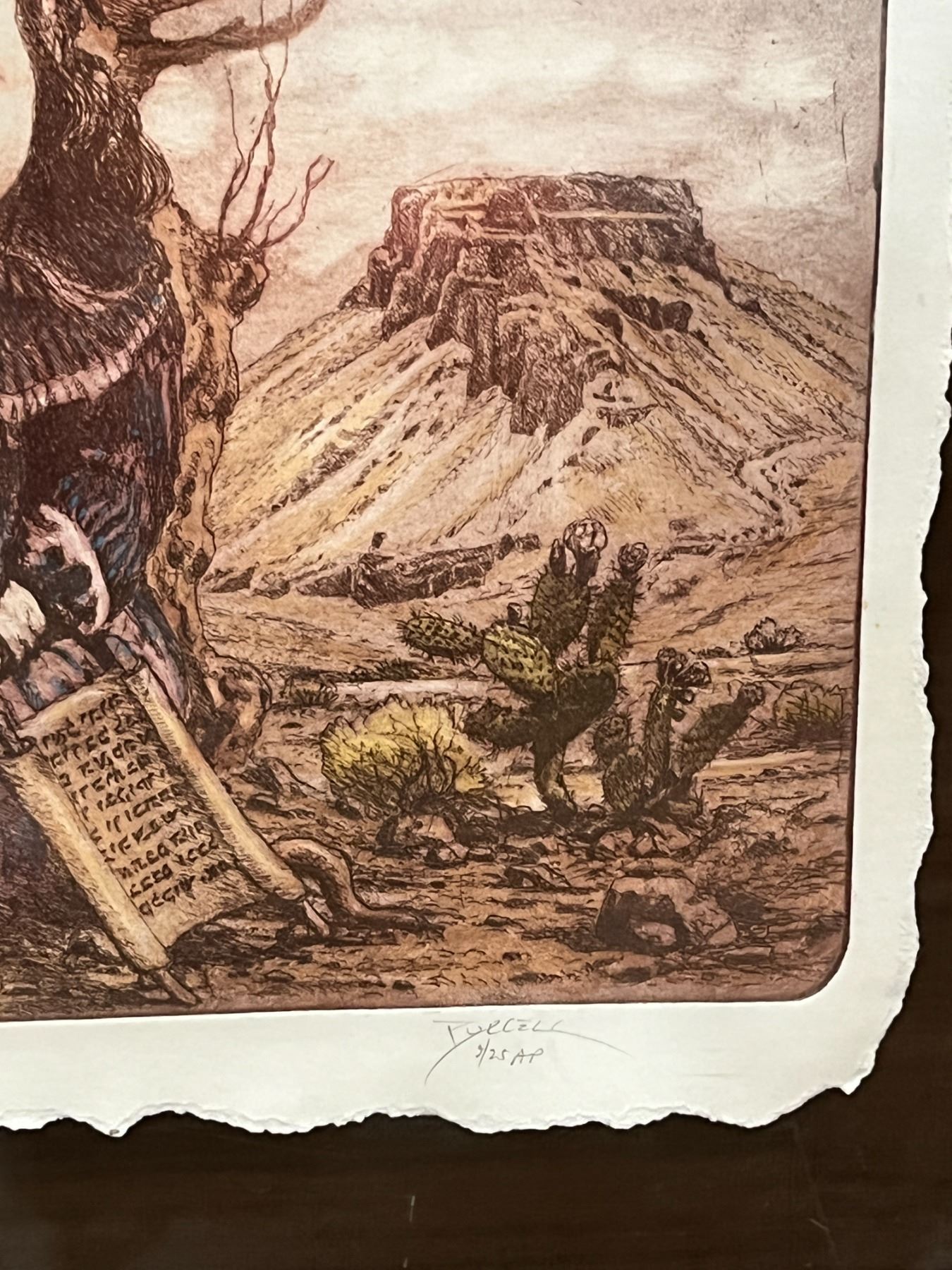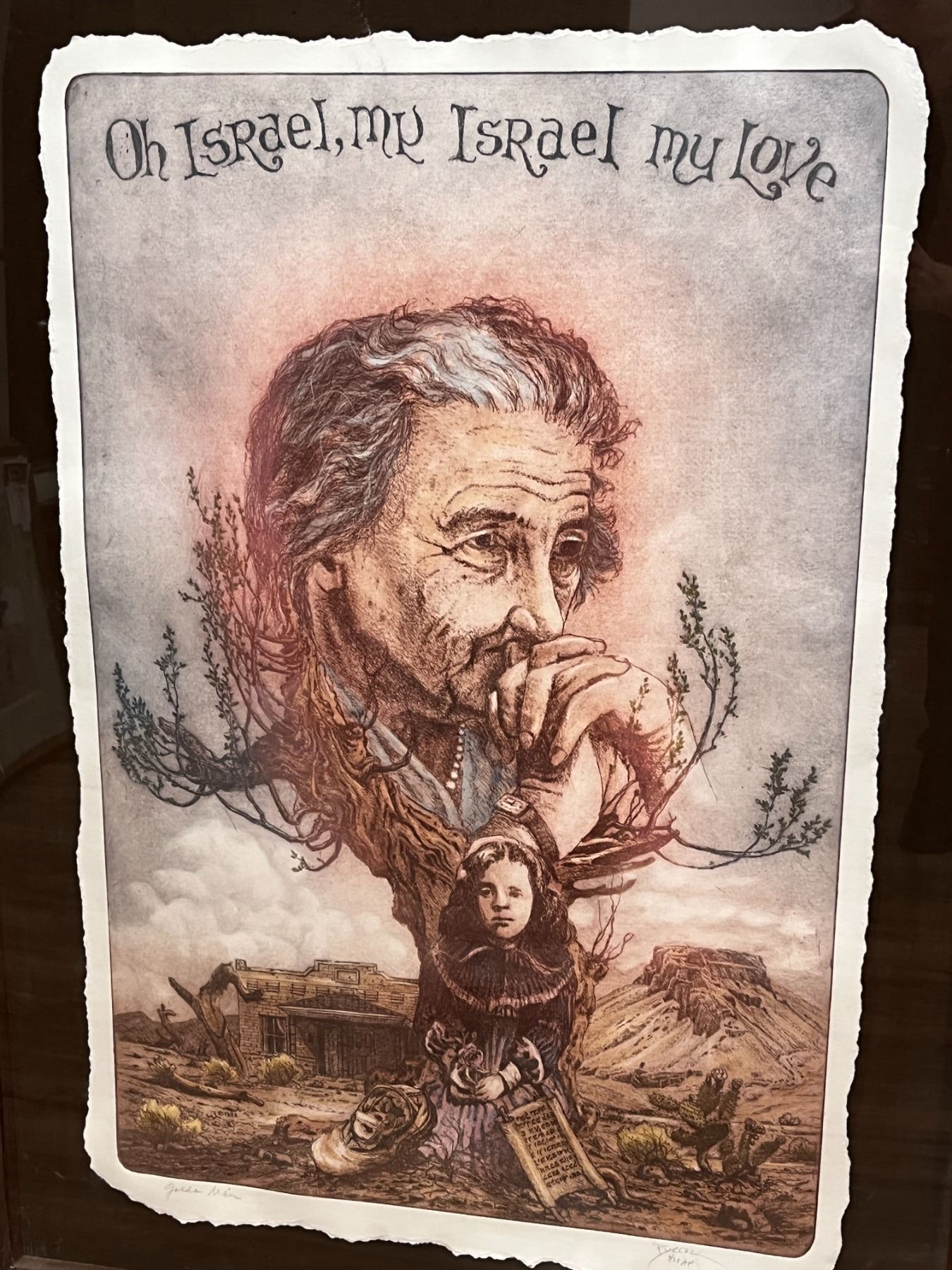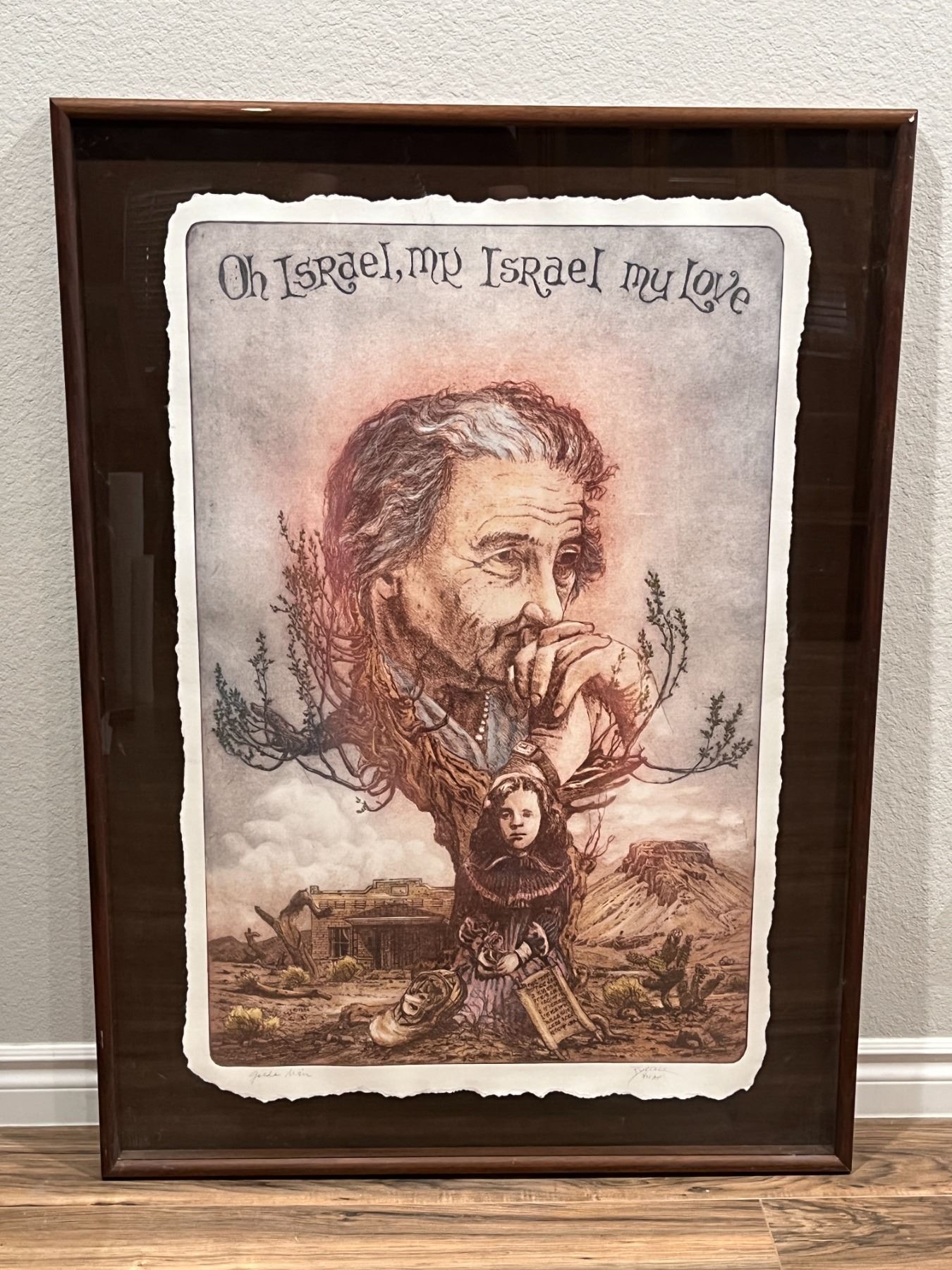 APPRAISER FAIR MARKET VALUE: $400 - "Golda Meir" by Roy Purcell (b. 1936): Limited edition Artist's Proof etching (#9/25) depicting the Israeli stateswoman and the text 'Oh Israel, My Israel, My Love. Hand-signed and numbered by the artist. Measures approximately 38" high by 25" wide unframed and 45" high by 33" wide framed. LT16
