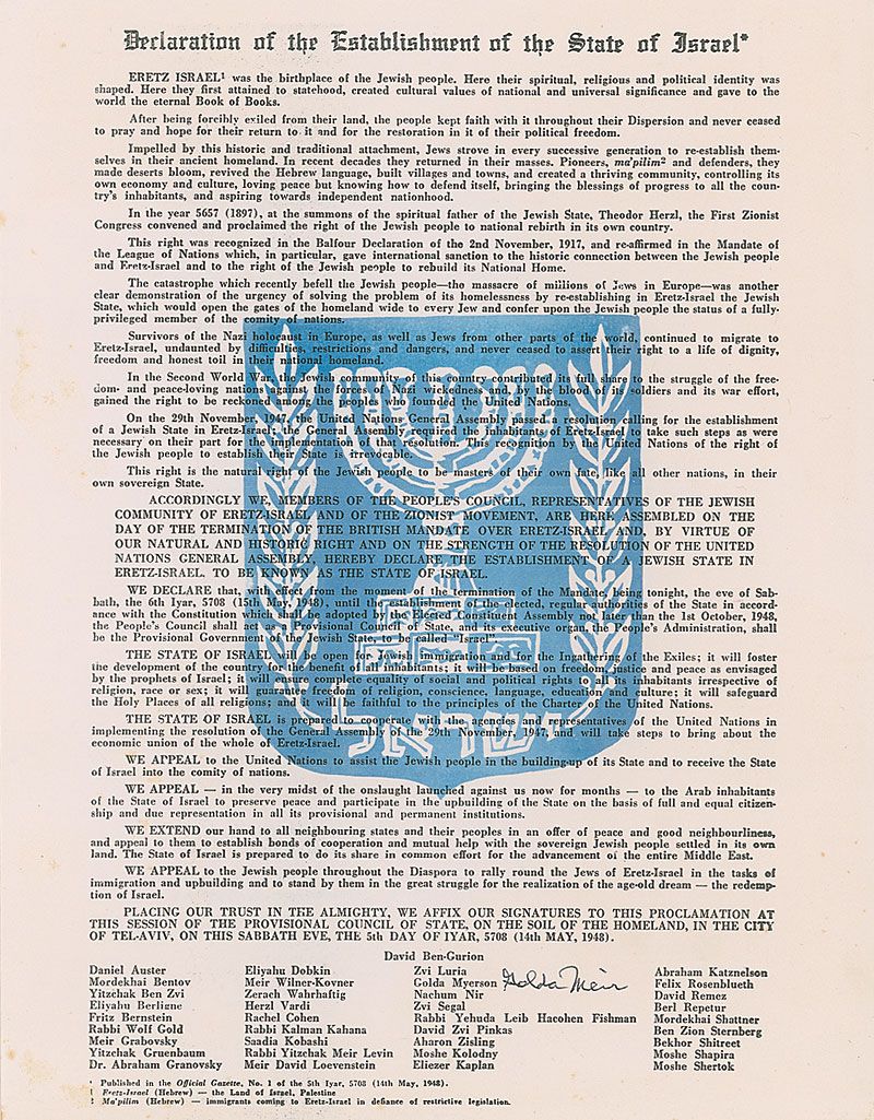 Souvenir typescript featuring the ‘Declaration of the Establishment of the State of Israel,’ one page, 8.5 x 11, signed at the bottom in black ballpoint by Meir. Light scattered foxing, otherwise fine condition.