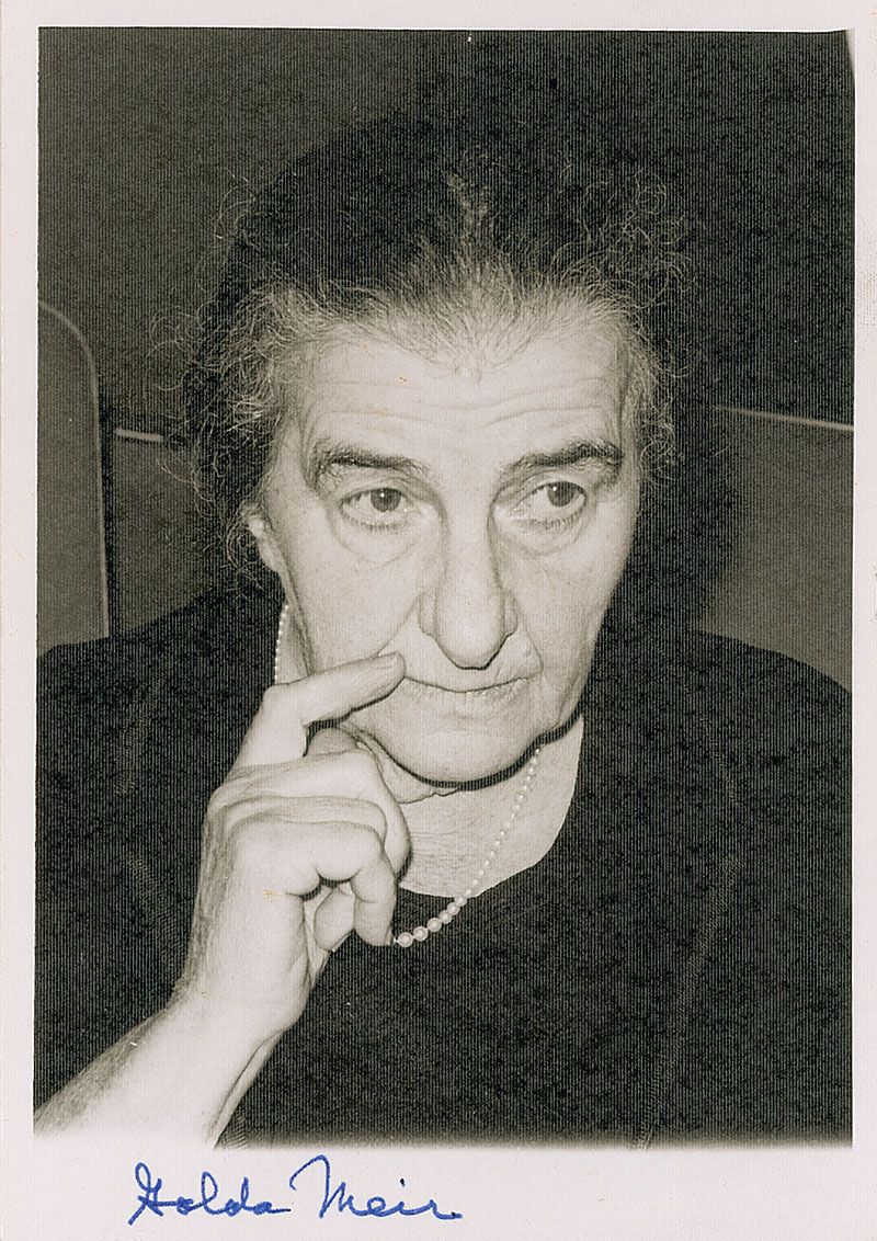 Satin-finish 4 x 5.75 head-and-shoulders photo of Meir, signed in the lower border in blue felt tip. In fine condition, with a trivial ding to the right edge.