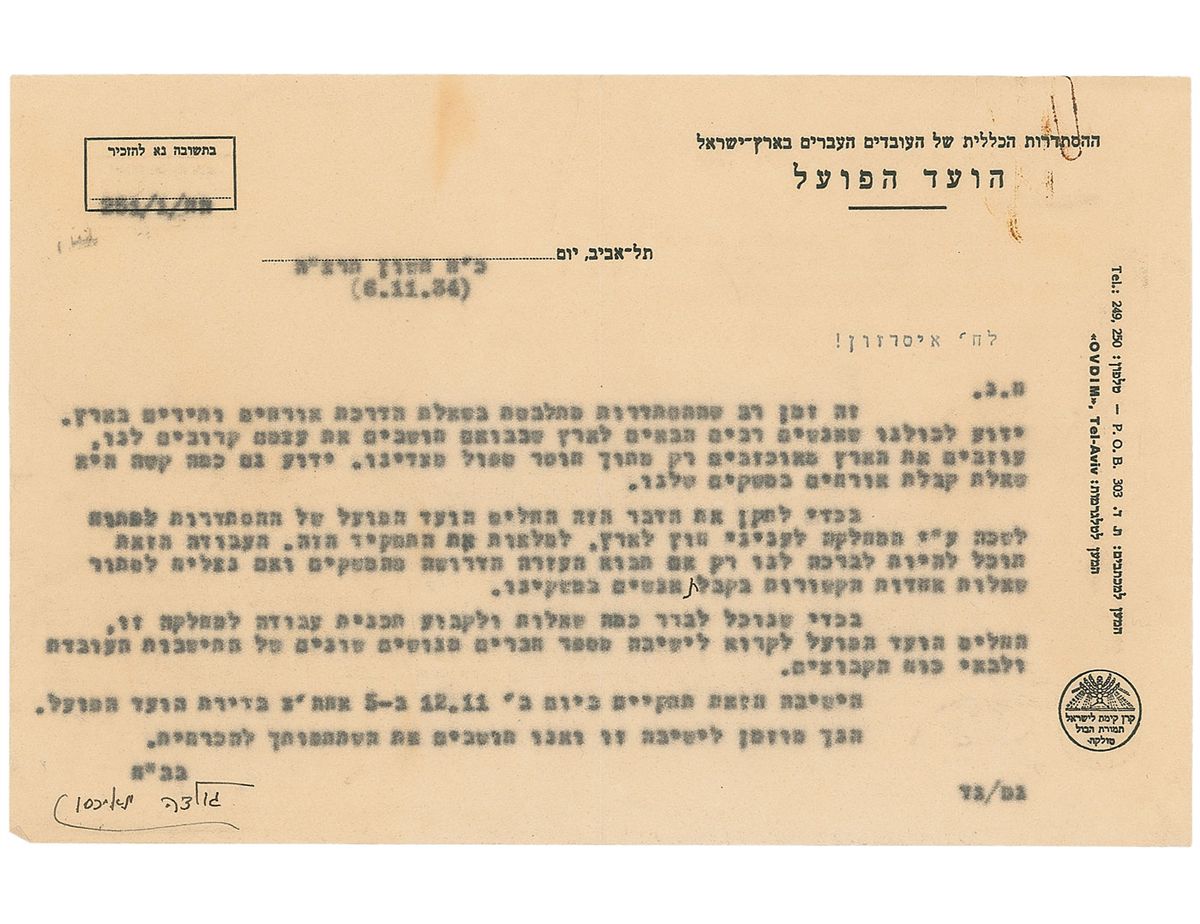 TLS in Hebrew, one carbon page, 8.5 x 5.5, Histadrut Executive Committee letterhead, November 6, 1934. Letter to Comrade Isserson. In part (translated): “For a long time now the Histadrut has been pondering the question of guiding visitors and tourists to the country. We all know that many people come to the country and upon their arrival see themselves as close to us, and they leave the country disappointed only because of our lack of attention…To fix this problem, the Histadrut’s Executive Committee has decided to open an office attached to the Department for Overseas Affairs, to fill this role…[we have] decided to call a meeting of some people from the Labor settlement movement and the representatives of the Kibbutzim.” Creases and rusty paperclip marks to lower left, otherwise fine condition. Meir’s letter reflects on the Fifth Aliyah, the mass immigration to Palestine from Europe and Asia during the 1930s. With Hitler’s rise to power in Germany in 1933, the increased persecution of Jews drove many to immigrate to the region.