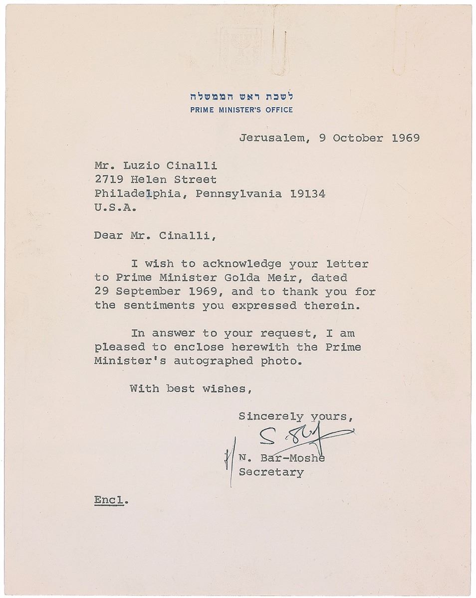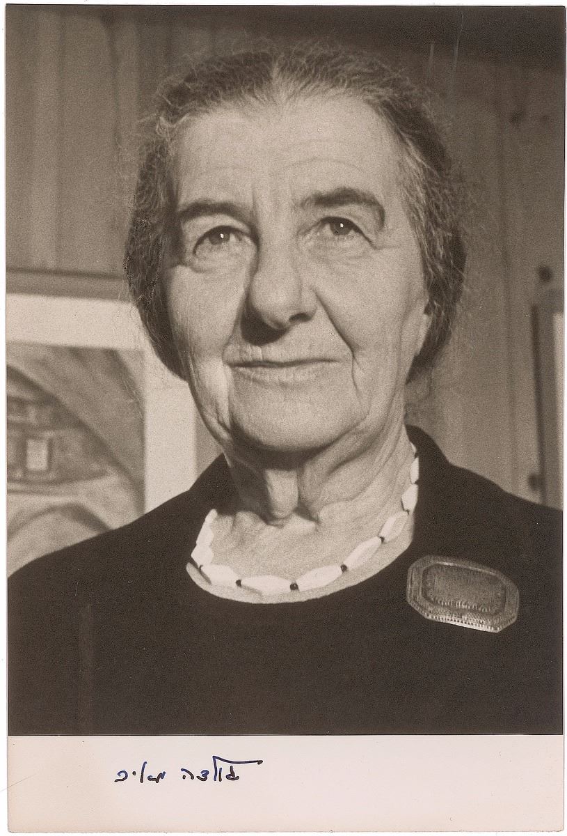 Matte-finish 4.5 x 6.75 bust-length photo of Meir wearing a brooch and necklace, signed in the lower border in blue ink. Reverse bears a David Harris photography stamp. In fine condition, with a paperclip impression to top edge. Accompanied by a letter of transmittal from the office of the prime minister.