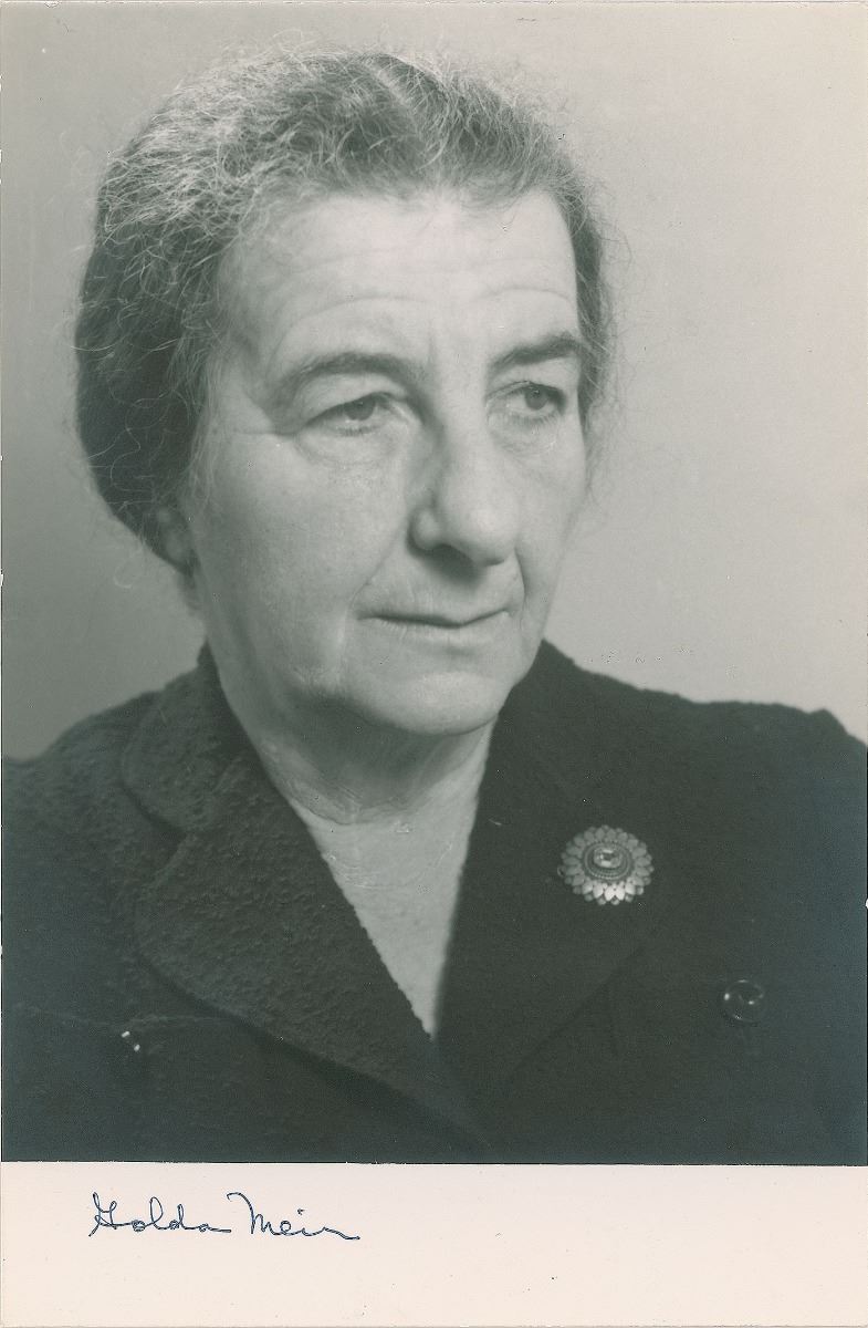 Matte-finish 4.5 x 7 photo of Meir, signed in the lower border in black ballpoint. Reverse bears a photography stamp of Alfred Bernheim. In fine condition.