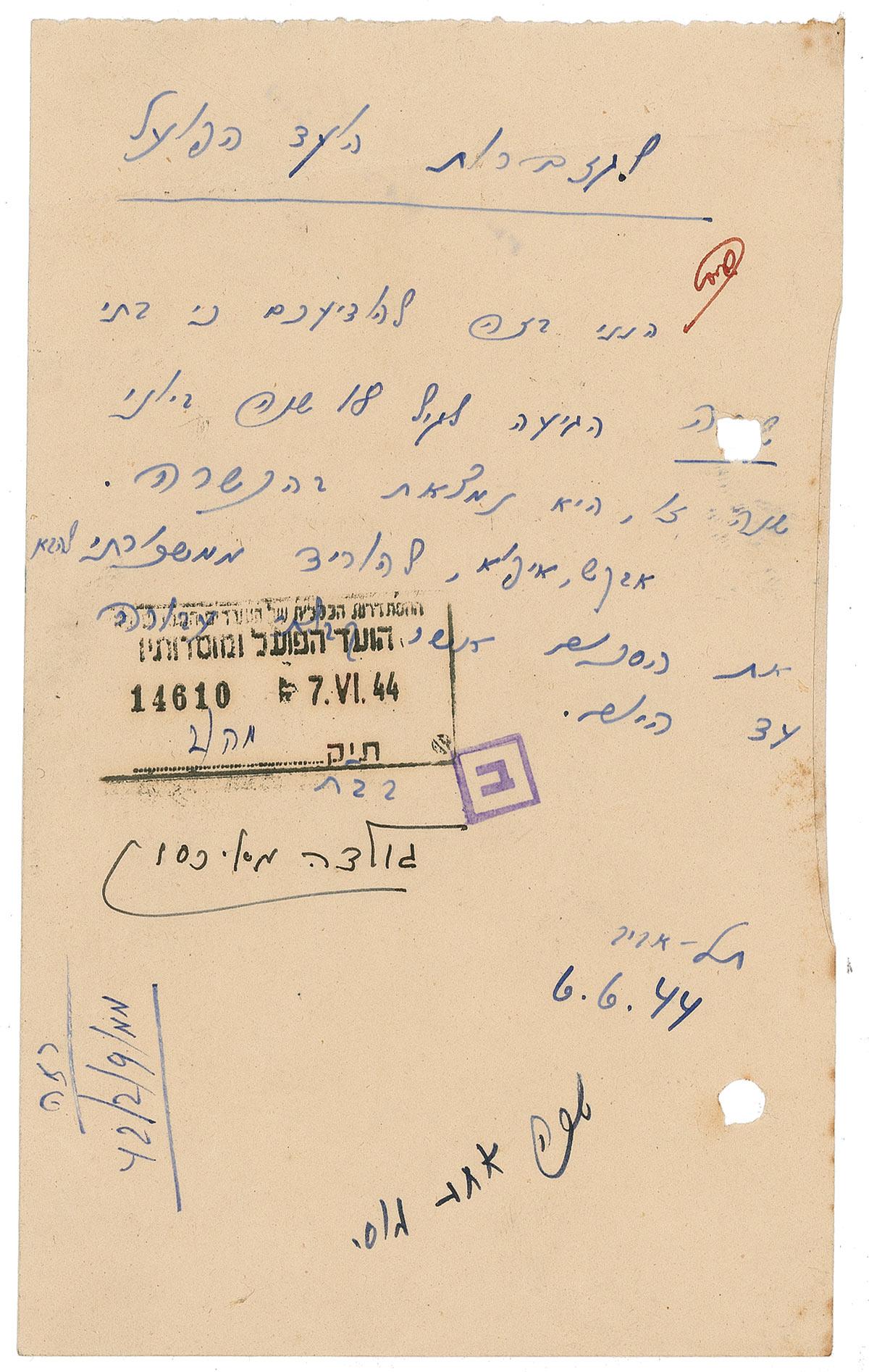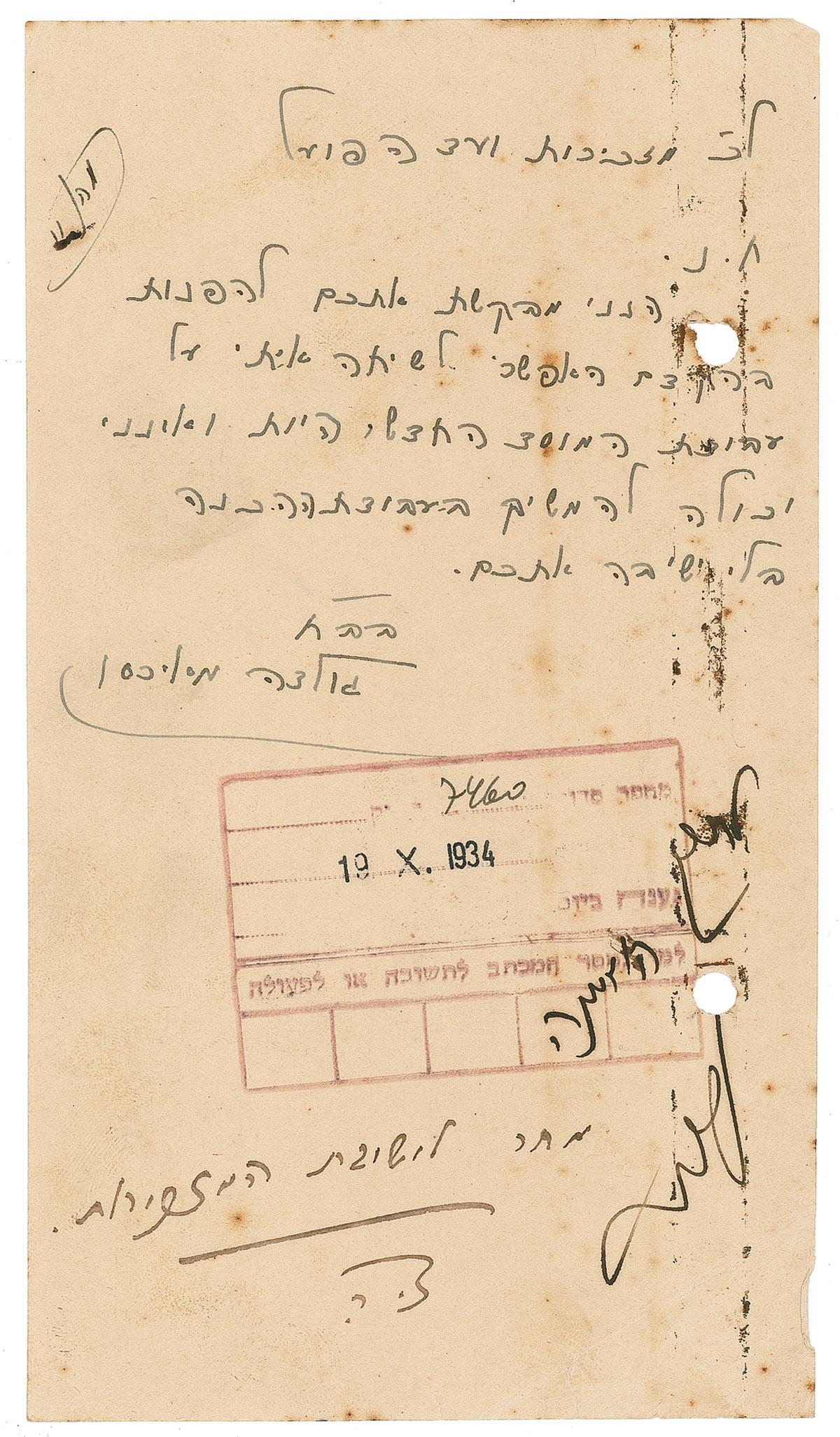 LS, signed “Golda Meirson,” dated October 19, 1939, to the Secretary of the Central Branch. In full (translated): “Please determine with me soon as possible the meeting about my new work in organization. I can’t continue to work without meeting.” In very good condition, with punch holes to right side, scattered toning and soiling, and several office stamps and notations.