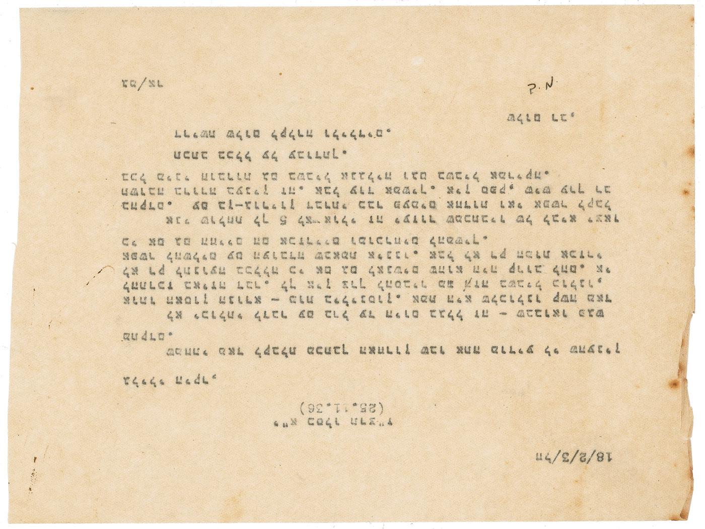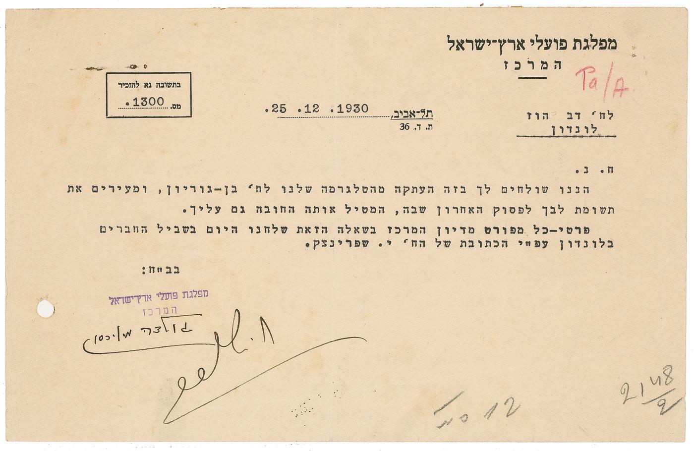 TLS, signed “Golda Meirson,” 8.5 x 5.5, dated December 25, 1930, to Dov Hoz. In part (translated): “We send you a copy of telegram to Ben-Gurion. Please pay attention to instructions, you must follow them. All details of central branch meeting we sent today to all members in London.” In very good condition, with central horizontal fold, punch hole to lower left, a uniform shade of mild toning, and several office notations.