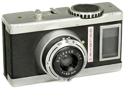 Goldammer: Goldix (4 x 4), um 1950 Goldammer, Frankfurt. Format: 4 x 4 cm auf 127er Film. Objektiv Goldeck 7,7/60 mm. Verschluß 1/30-1/100, B. Seitlicher Sucher.