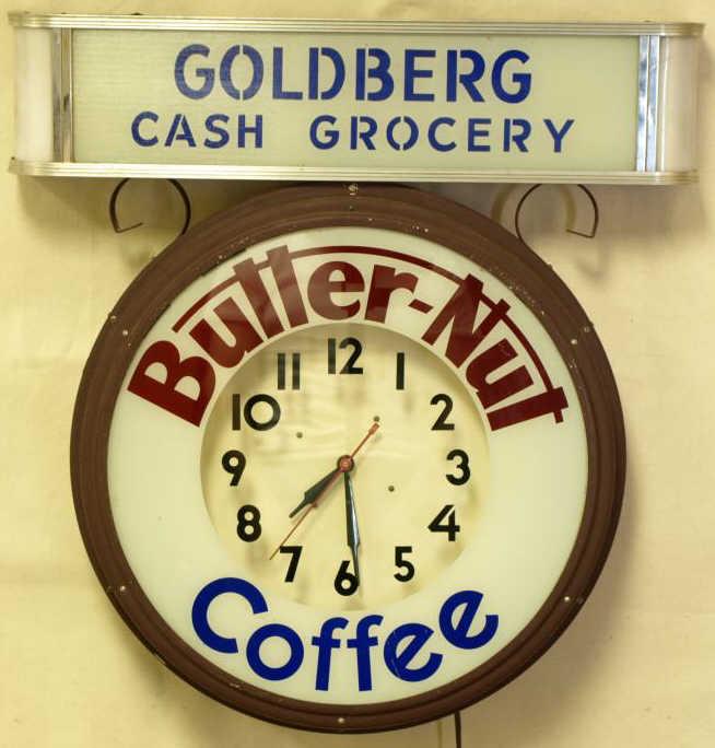 original from Historic Goldberg Grocery Store, Main Street Deadwood, SD. Clock is in excellent condition with all lights working and keeps perfect time. A great piece of advertising memorabilia. Measures 26" wide X 28" tall.