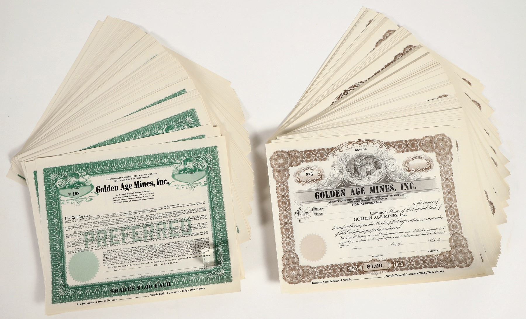 About 250 Golden Age Mines, Inc. unissued stock certificates from the 1940s.