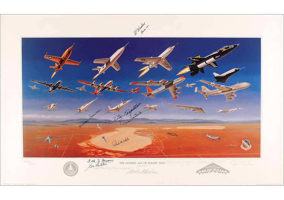 Color limited edition 30 x 18 print entitled Golden Age of Flight, numbered #226/1000, signed in pencil by Chuck Yeager, Joe Engle, and Bob Cardenas and signed in black felt tipby Al Worden, Ken Chillstrom, Fred Ascani, Robert M. White, Whitey Feightner, Gene Deatrick, and Scrappy Johnson. Also signed in pencil by the artist, Mike Machat. Rolled and in fine condition.