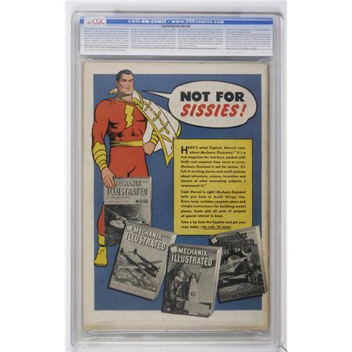 The longtime backup character from <B>Whiz Comics </B></I>stars here. This is one of the few Fawcett #1 issues <I>not </B></I>to have Captain Marvel on the cover introducing the hero! Never fear, though -- the Big Red Cheese is on the back cover telling us that <B>Mechanix Illustrated</B></I> is "not for sissies." Overstreet 2006 VF 8.0 value = $544. CGC census 11/06: 3 in 7.5, 3 higher.<BR><BR><b>Shipping:</b> Slabbed Comic (<a target="_blank" href="http://www.heritageauctions.com/common/shipping.php">view shipping information</a>)